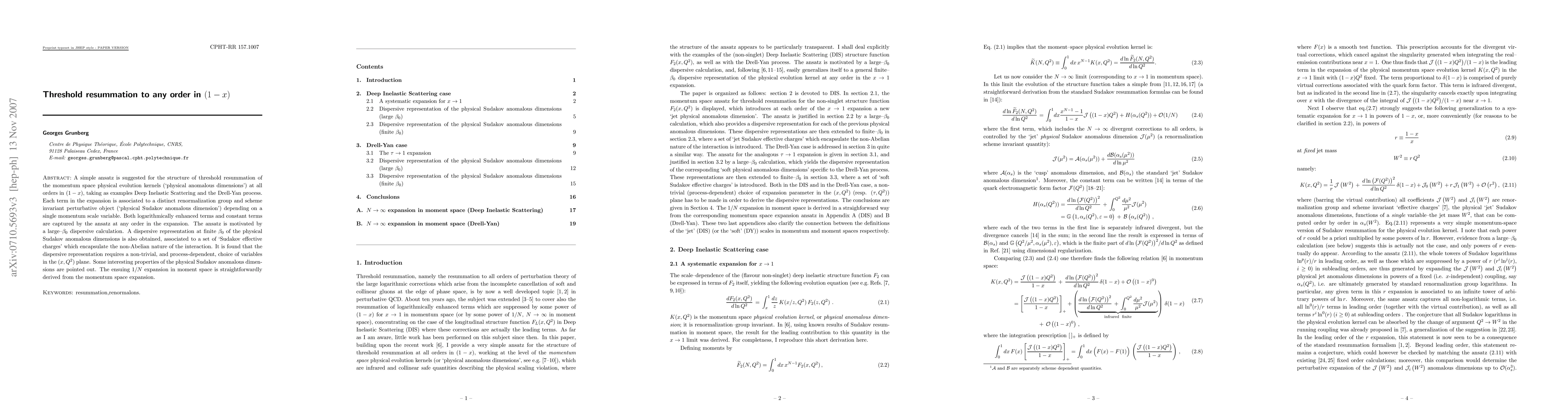 A simple ansatz is suggested for the structure of threshold resummation of the momentum space physical evolution kernels (`physical anomalous dimensions') at all orders in (1-x), taking as examples Deep Inelastic Scattering (F_2(x, Q^2) and F_L(x, Q^2)) and the Drell-Yan process. Each term in the expansion is associated to a distinct renormalization group and scheme invariant perturbative object (`physical Sudakov anomalous dimension') depending on a single momentum scale variable. Both logarithmically enhanced terms and constant terms are captured by the ansatz at any order in the expansion. The ansatz is motivated by a large--beta_0 dispersive calculation. A dispersive representation at finite beta_0 of the physical Sudakov anomalous dimensions is also obtained, associated to a set of `Sudakov effective charges' which encapsulate the non-Abelian nature of the interaction. It is found that the dispersive representation requires a non-trivial, and process-dependent, choice of variables in the (x,Q^2) plane. Some interesting properties of the physical Sudakov anomalous dimensions are pointed out. The ensuing 1/N expansion in moment space is straightforwardly derived from the momentum space expansion.