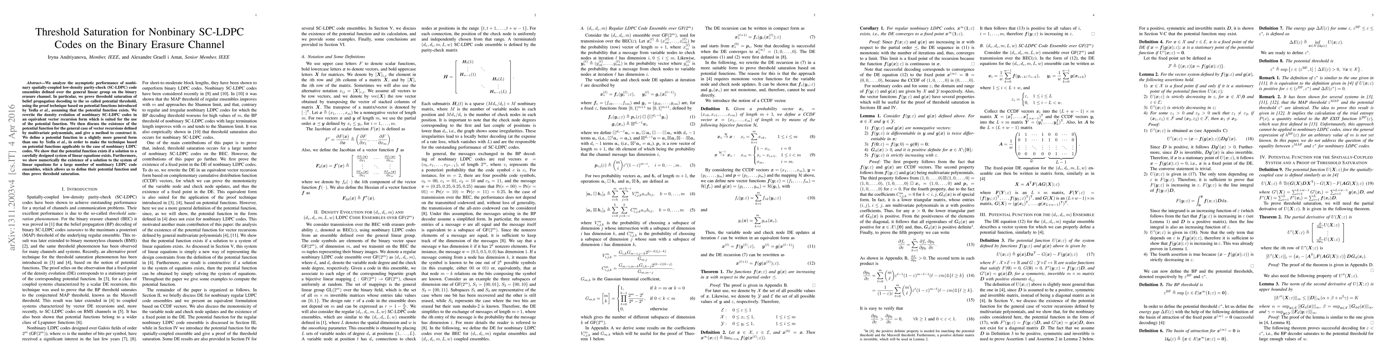 This paper analyzes the asymptotic performance of nonbinary spatially-coupled low-density parity-check (SC-LDPC) codes on the binary erasure channel, proving threshold saturation of belief propagation decoding using potential function techniques. It establishes the existence of a potential function for these codes, showing numerically that solutions to linear equations enable the definition of this function, thus proving threshold saturation.