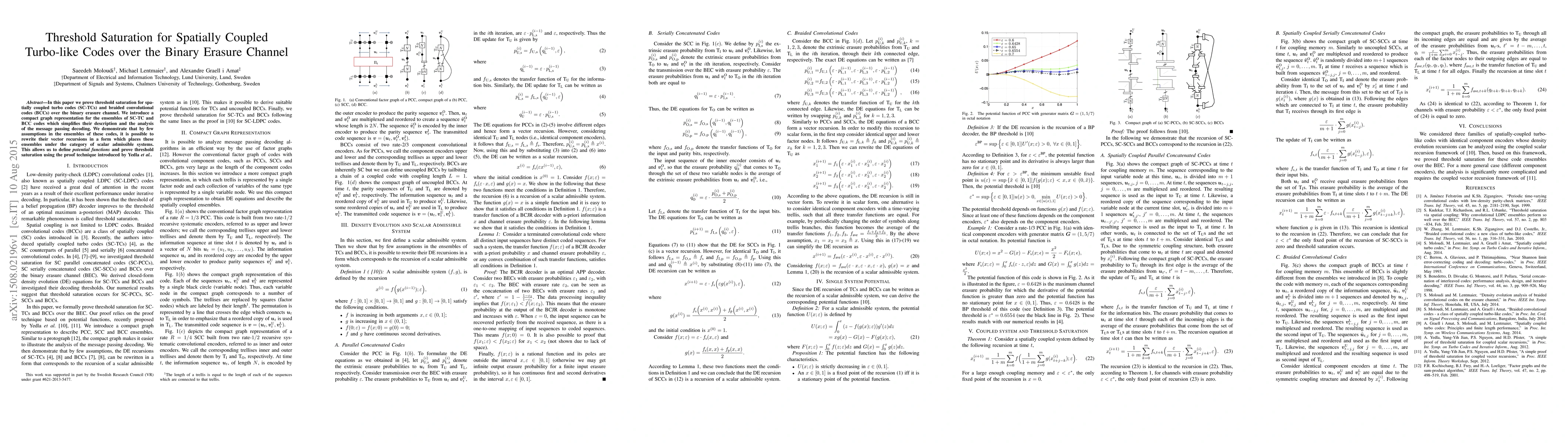 This paper proves threshold saturation for spatially coupled turbo codes and braided convolutional codes over the binary erasure channel, introducing a simplified graph representation and demonstrating their classification as scalar admissible systems. This enables the application of potential functions to prove the threshold saturation, following a method introduced by Yedla et al.