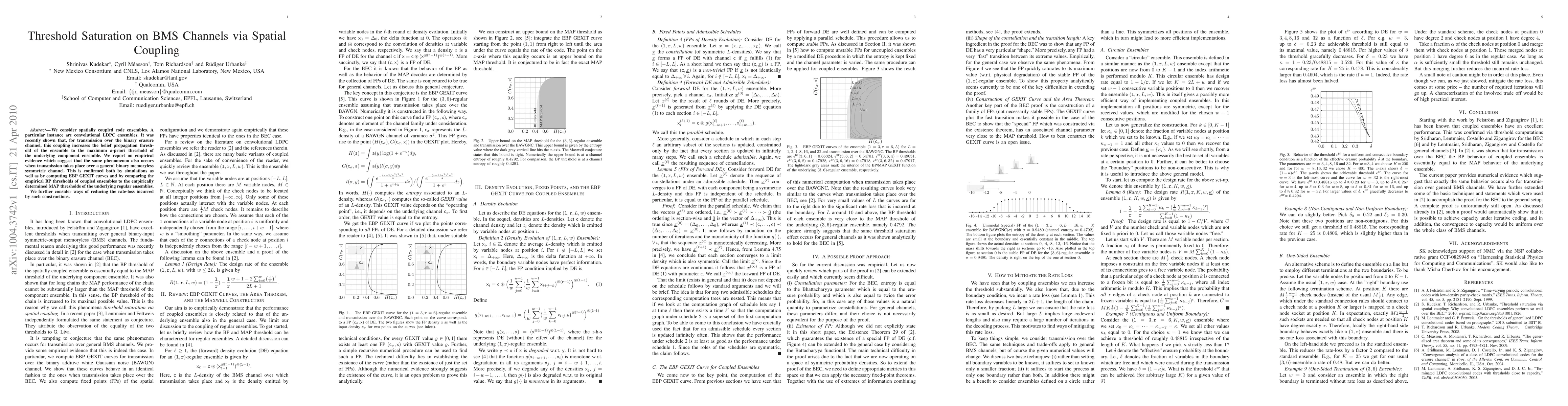 We consider spatially coupled code ensembles. A particular instance are convolutional LDPC ensembles. It was recently shown that, for transmission over the binary erasure channel, this coupling increases the belief propagation threshold of the ensemble to the maximum a-priori threshold of the underlying component ensemble. We report on empirical evidence which suggest that the same phenomenon also occurs when transmission takes place over a general binary memoryless symmetric channel. This is confirmed both by simulations as well as by computing EBP GEXIT curves and by comparing the empirical BP thresholds of coupled ensembles to the empirically determined MAP thresholds of the underlying regular ensembles. We further consider ways of reducing the rate-loss incurred by such constructions.