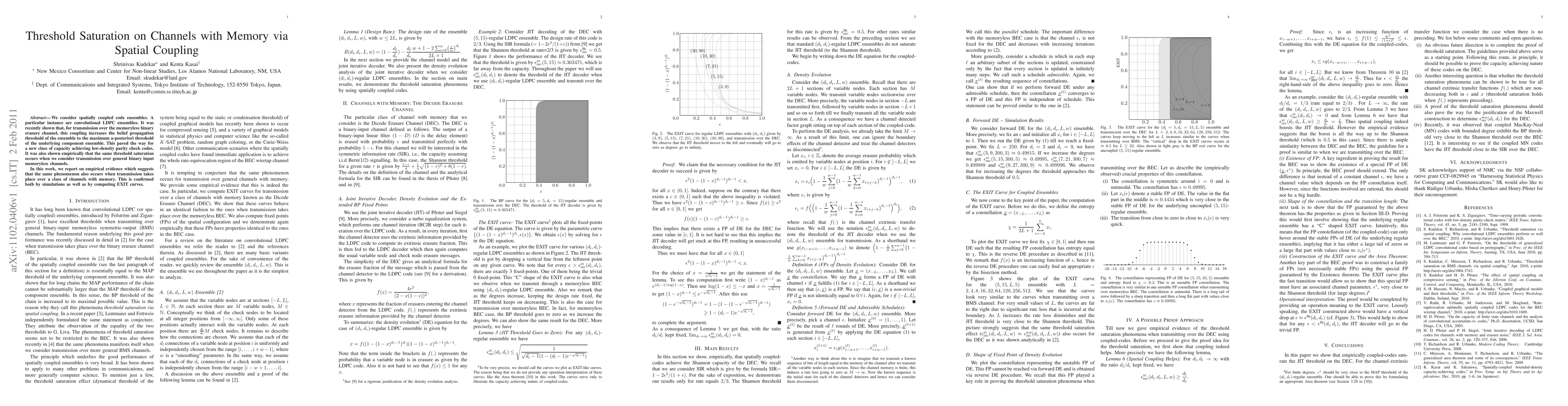 We consider spatially coupled code ensembles. A particular instance are convolutional LDPC ensembles. It was recently shown that, for transmission over the memoryless binary erasure channel, this coupling increases the belief propagation threshold of the ensemble to the maximum a-posteriori threshold of the underlying component ensemble. This paved the way for a new class of capacity achieving low-density parity check codes. It was also shown empirically that the same threshold saturation occurs when we consider transmission over general binary input memoryless channels. In this work, we report on empirical evidence which suggests that the same phenomenon also occurs when transmission takes place over a class of channels with memory. This is confirmed both by simulations as well as by computing EXIT curves.