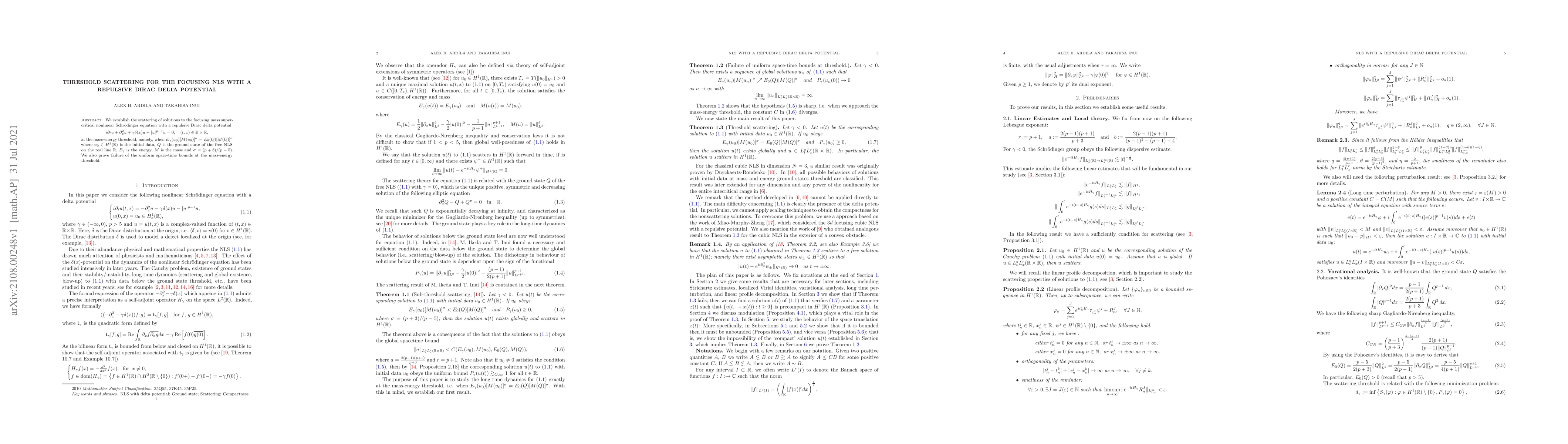 This paper establishes the scattering of solutions to a focusing mass supercritical nonlinear Schrödinger equation with a repulsive Dirac delta potential at the mass-energy threshold, and proves the failure of uniform space-time bounds at this threshold.