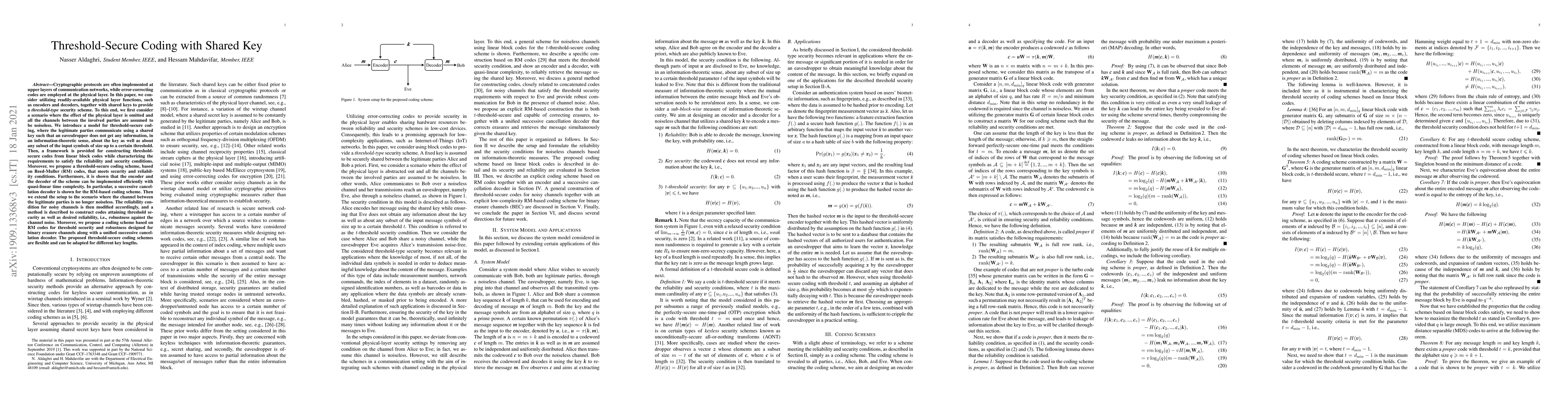 This paper proposes a new method for secure coding using shared keys and Reed-Muller codes to achieve threshold-type security in communication networks.