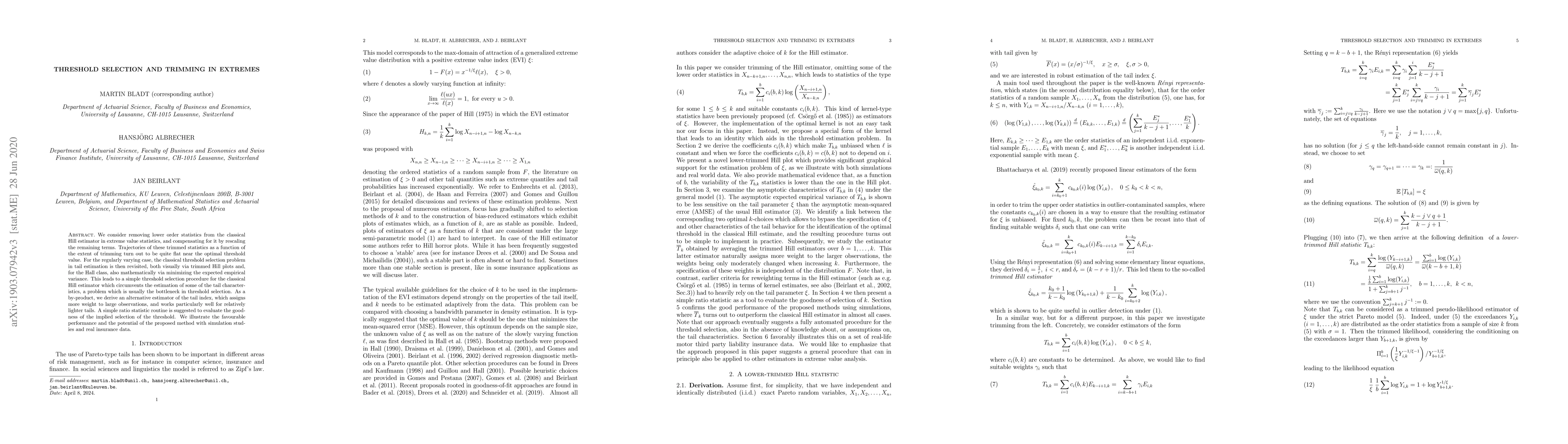 This paper proposes a method for selecting thresholds in extreme value statistics by trimming lower order statistics from the Hill estimator and rescaling the remaining terms. The method simplifies threshold selection by minimizing the expected empirical variance, leading to improved performance for lighter tails.