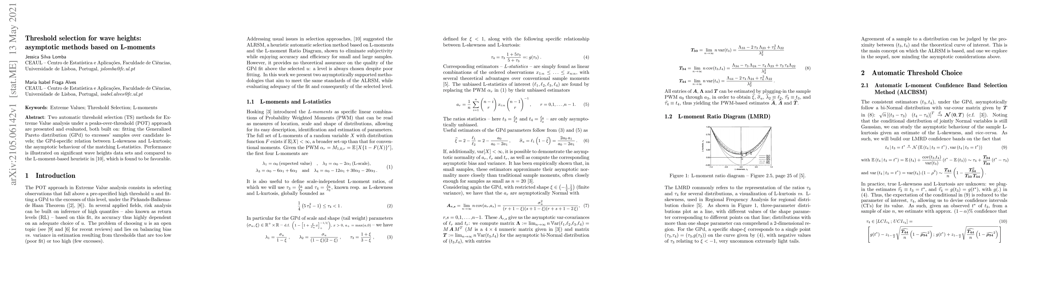 Two automatic threshold selection (TS) methods for Extreme Value analysis under a peaks-over-threshold (POT) approach are presented and evaluated, both built on: fitting the Generalized Pareto distribution (GPd) to excesses' samples over candidate levels ; the GPd-specific relation between L-skewness and L-kurtosis; the asymptotic behaviour of the matching L-statistics. Performance is illustrated on significant wave heights data sets and compared to the L-moment-based heuristic in [10], which is found to be favorable. PUBLISHED VERSION AVAILABLE AT: https://www.spestatistica.pt/storage/app/uploads/public/609/28f/6d0/60928f6d08a0c016386627.pdf