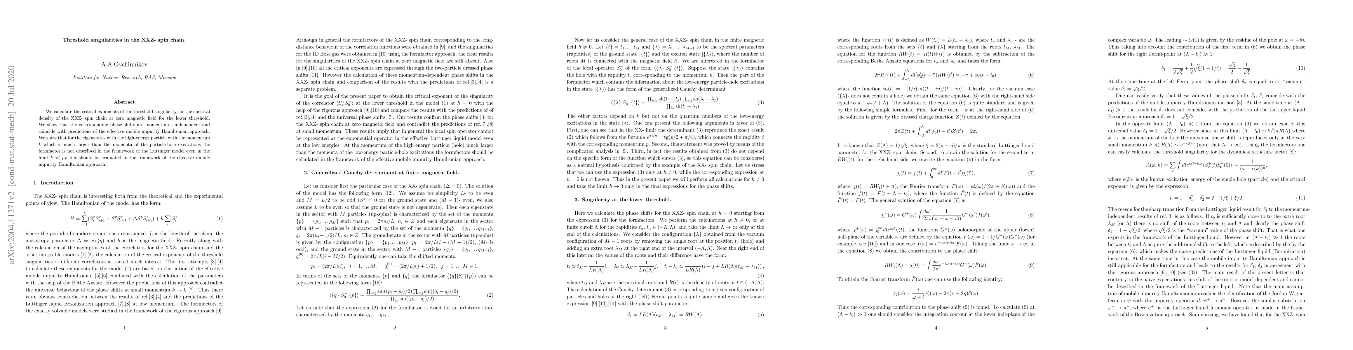 This paper investigates the critical exponents of the threshold singularity in the spectral density of the XXZ spin chain at zero magnetic field, demonstrating that the phase shifts are momentum-independent and align with predictions from the effective mobile impurity Hamiltonian approach. It also reveals that high-energy particle eigenstates with large momentum cannot be described by the Luttinger model, necessitating the effective mobile impurity Hamiltonian framework for accurate evaluation.