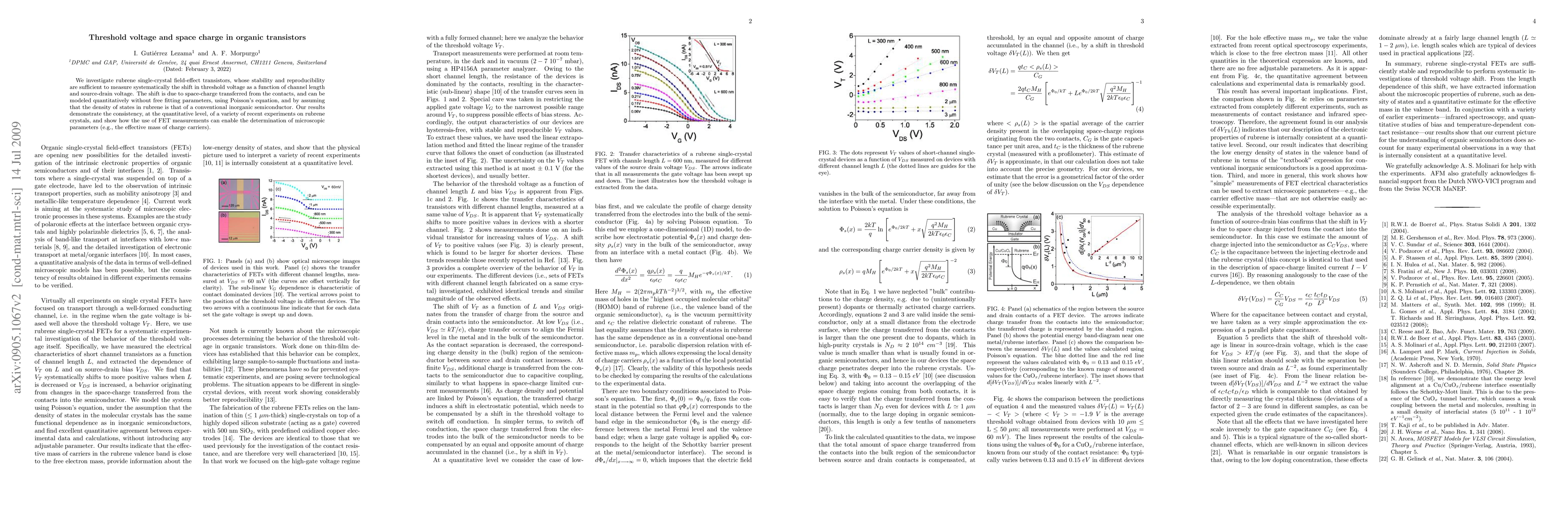 This research examines rubrene single-crystal field-effect transistors, finding that threshold voltage shifts due to space-charge from contacts. These shifts can be precisely modeled using Poisson's equation, validating numerous recent experiments and demonstrating the potential of FET measurements for determining microscopic parameters like charge carrier effective mass.
