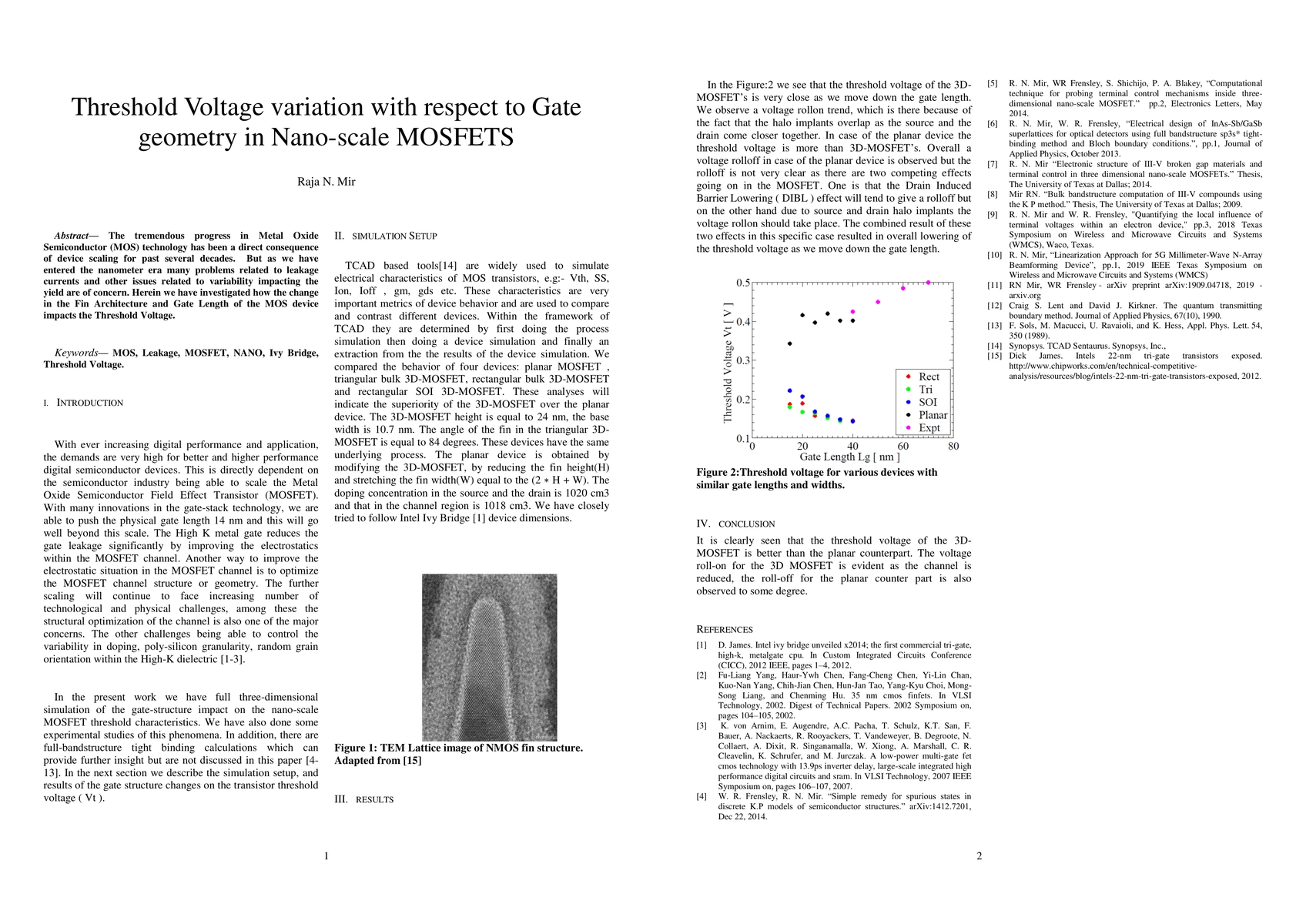 The tremendous progress in Metal Oxide Semiconductor (MOS) technology has been a direct consequence of device scaling for past several decades. But as we have entered the nanometer era many problems related to leakage currents and other issues related to variability impacting the yield are of concern. Herein we have investigated how the change in the Fin Architecture and Gate Length of the MOS device impacts the Threshold Voltage.