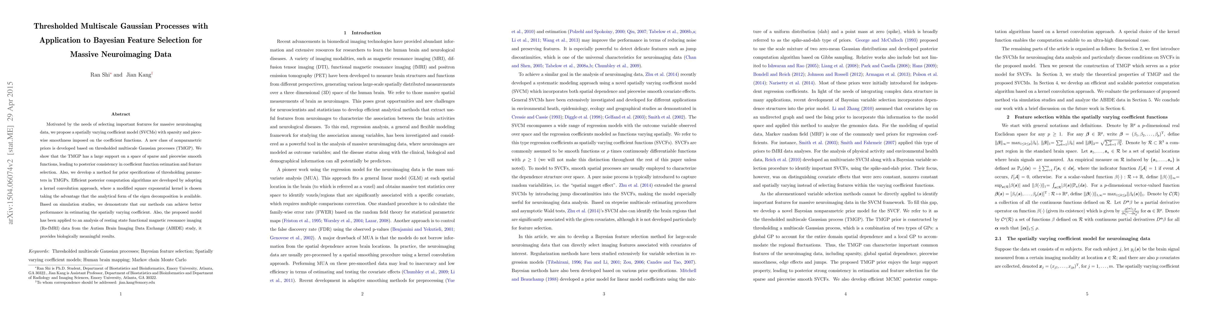This paper proposes a spatially varying coefficient model with sparsity and smoothness constraints for selecting important features in massive neuroimaging data. The authors develop a new class of nonparametric priors based on thresholded multiresolution Gaussian processes, demonstrating posterior consistency and efficient posterior computation algorithms. The method is shown to outperform existing techniques in simulations and provides meaningful results in analyzing Rs-fMRI data from the ABIDE study.