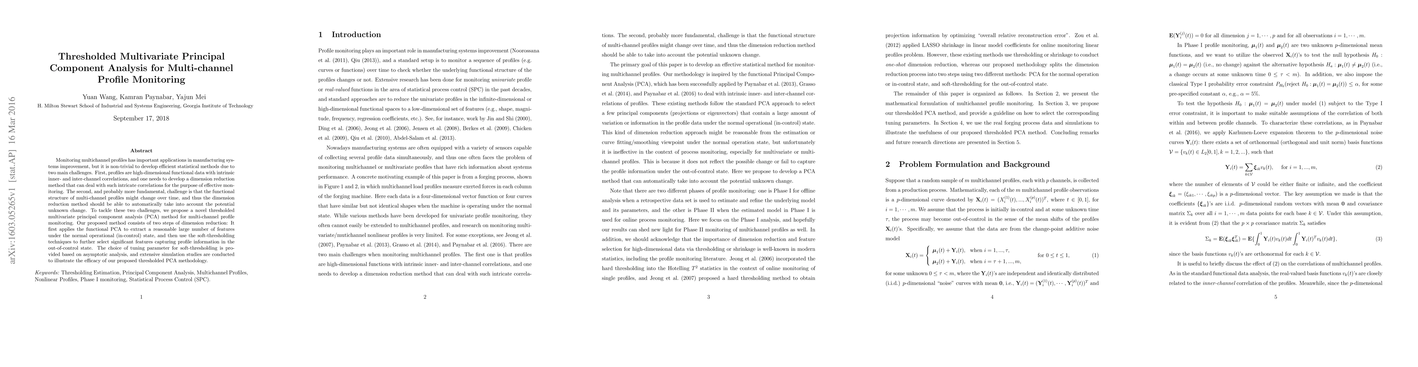 A new method called thresholded multivariate principal component analysis is proposed to monitor multi-channel profiles in manufacturing systems. It can handle high-dimensional functional data with changing structures over time.