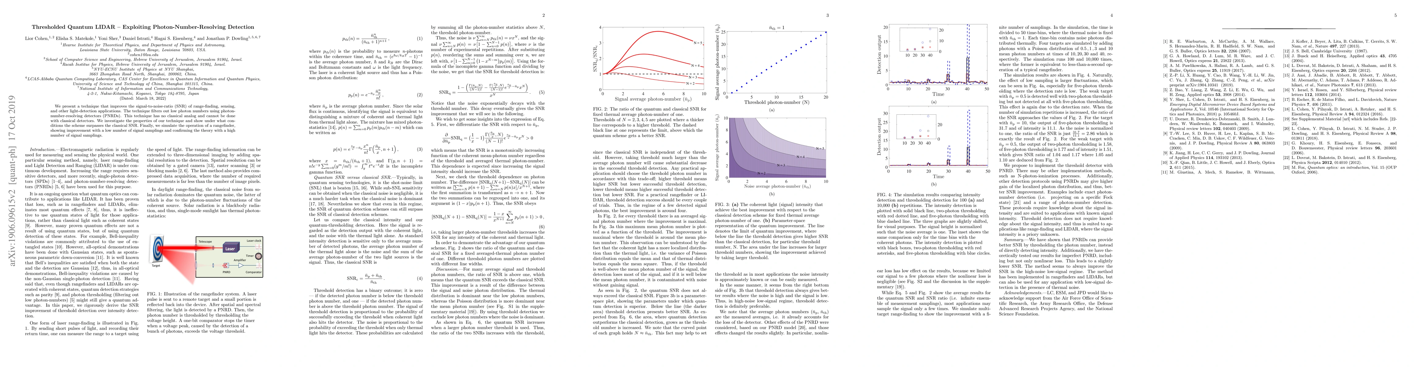 This research introduces a method, Thresholded Quantum LIDAR, that enhances signal-to-noise-ratio (SNR) in applications like range-finding and light detection using photon-number-resolving detectors (PNRDs). The study demonstrates conditions under which this quantum technique surpasses classical SNR, supported by simulations of a rangefinder showing improved performance with fewer signal samplings.