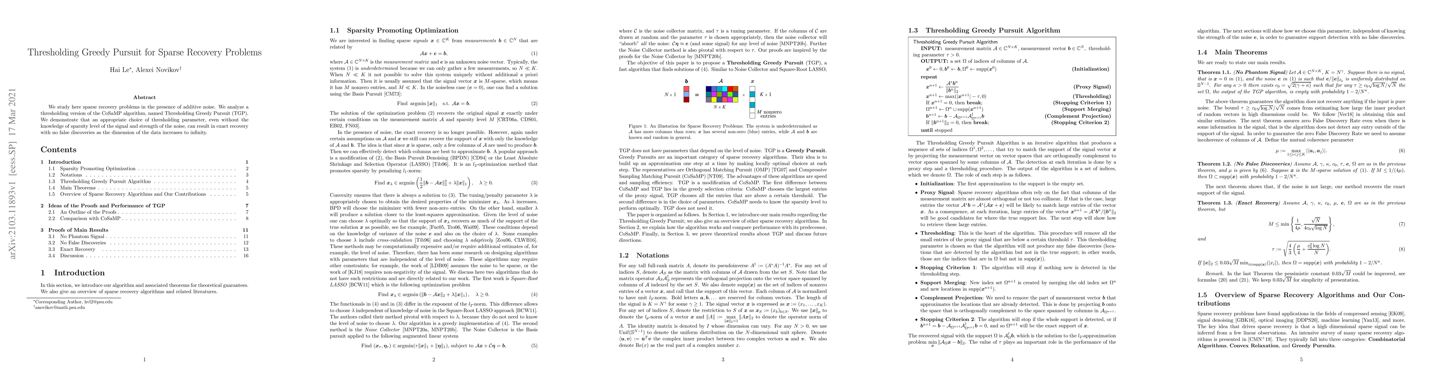 This paper investigates sparse recovery in noisy settings using a thresholding version of the CoSaMP algorithm called Thresholding Greedy Pursuit (TGP). It shows that an appropriately chosen thresholding parameter can achieve exact signal recovery without false discoveries, regardless of the signal's sparsity level or noise strength.