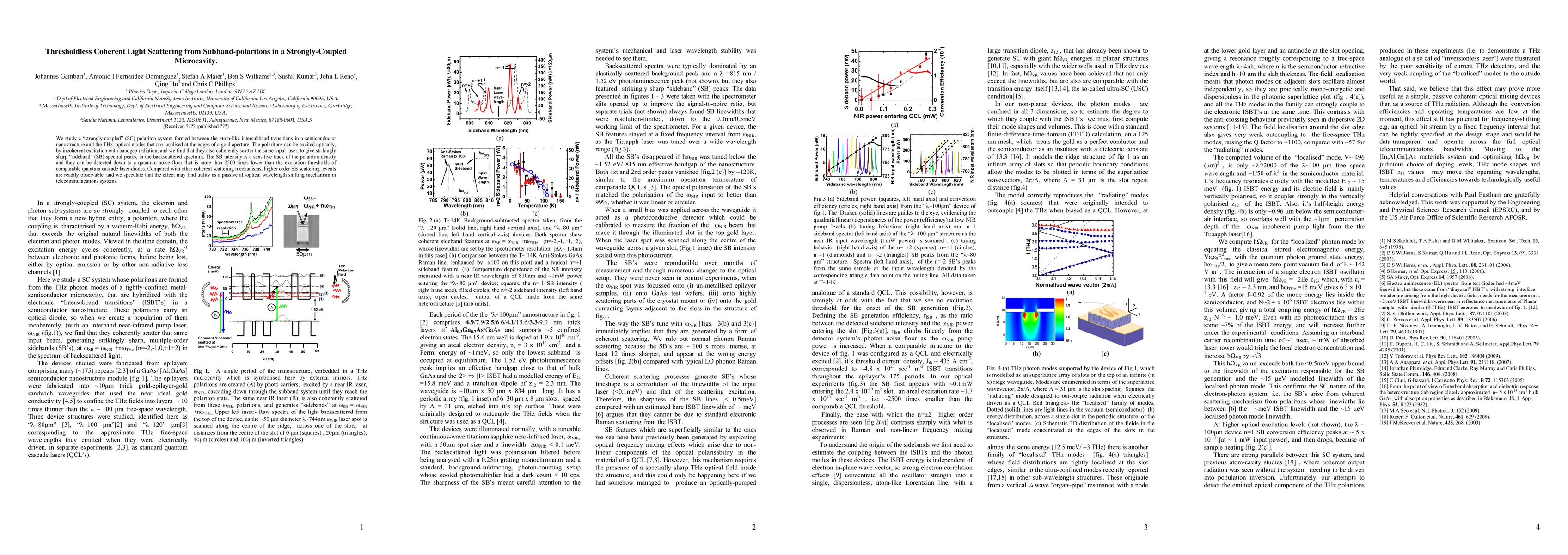 We study a "strongly-coupled" (SC) polariton system formed between the atom-like intersubband transitions in a semiconductor nanostructure and the THz optical modes that are localised at the edges of a gold aperture. The polaritons can be excited optically, by incoherent excitation with bandgap radiation, and we find that they also coherently scatter the same input laser, to give strikingly sharp "sideband" (SB) spectral peaks in the backscattered spectrum. The SB intensity is a sensitive track of the polariton density and they can be detected down to a quantum noise floor that is more than 2500 times lower than the excitation thresholds of comparable quantum cascade laser diodes. Compared with other coherent scattering mechanisms, higher order SB scattering events are readily observable, and we speculate that the effect may find utility as a passive all-optical wavelength shifting mechanism in telecommunications systems.
