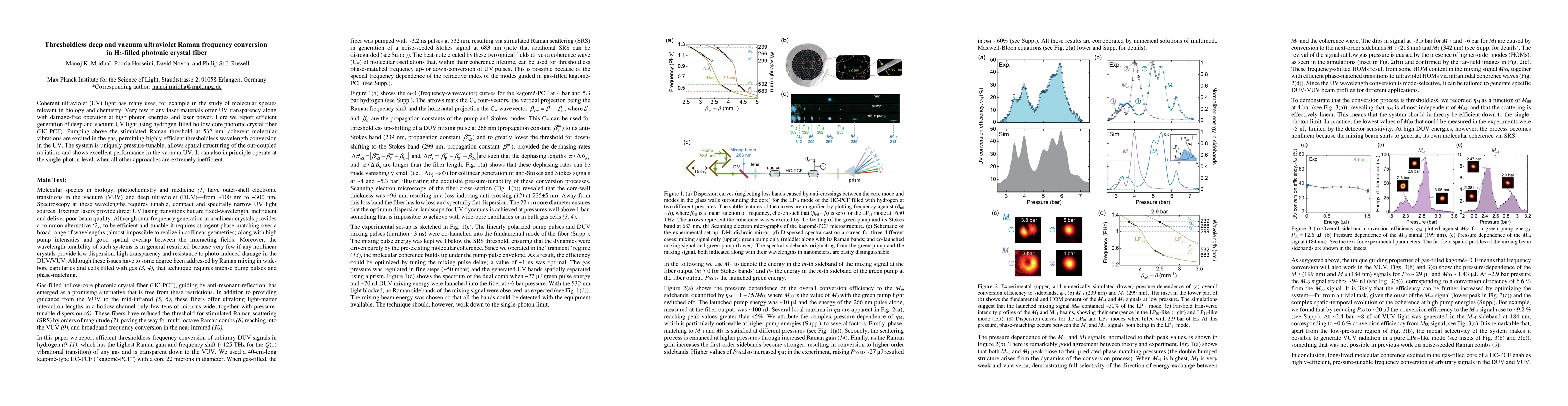 This paper reports the efficient generation of deep and vacuum ultraviolet light using hydrogen-filled hollow-core photonic crystal fiber, enabling thresholdless Raman frequency conversion at 532 nm. The system is pressure-tunable, allows for the structuring of emitted radiation, and performs well in the vacuum UV, potentially operating at single-photon levels.