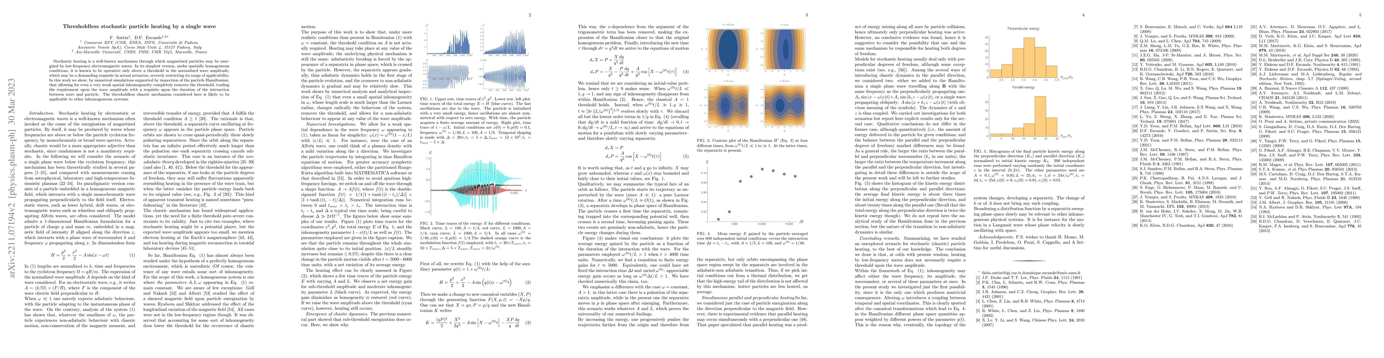Stochastic heating is a well-known mechanism through which magnetized particles may be energized by low-frequency electromagnetic waves. In its simplest version, under spatially homogeneous conditions, it is known to be operative only above a threshold in the normalized wave amplitude, which may be a demanding requisite in actual scenarios, severely restricting its range of applicability. In this work we show, by numerical simulations supported by inspection of the particle Hamiltonian, that allowing for even a very weak spatial inhomogeneity completely removes the threshold, trading the requirement upon the wave amplitude with a requisite upon the duration of the interaction between wave and particle. The thresholdless chaotic mechanism considered here is likely to be applicable to other inhomogeneous systems.