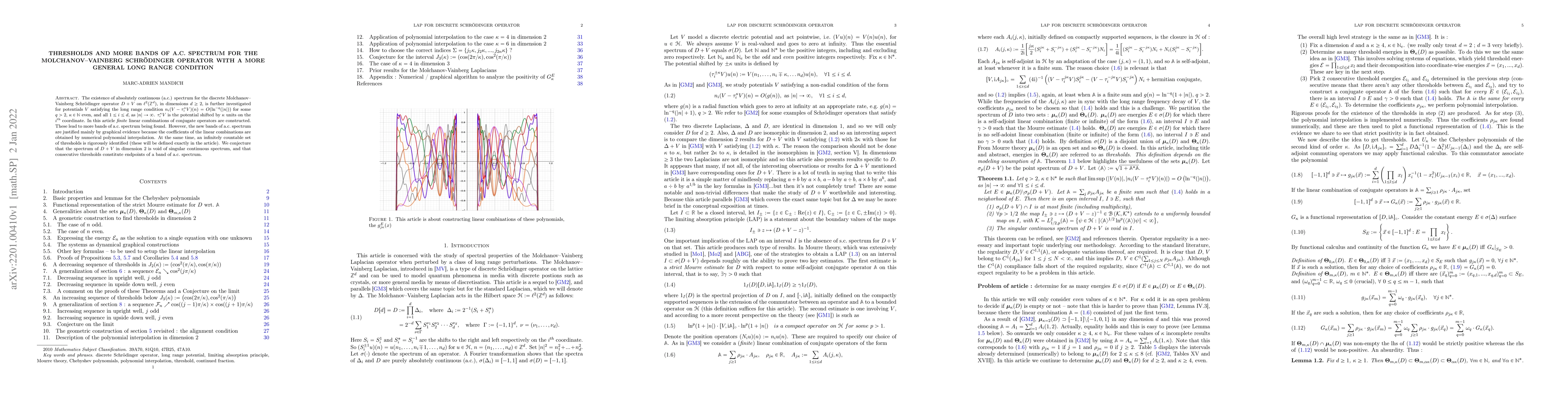 The existence of absolutely continuous (a.c.) spectrum for the discrete Molchanov-Vainberg Schr\"odinger operator $D+V$ on $\ell^2(\mathbb{Z}^d)$, in dimensions $d\geq 2$, is further investigated for potentials $V$ satisfying the long range condition $n_i(V-\tau_i ^{\kappa}V)(n) = O(\ln^{-q}(|n|))$ for some $q>2$, $\kappa \in \mathbb{N}$ even, and all $1 \leq i \leq d$, as $|n| \to \infty$. $\tau_i ^{\kappa} V$ is the potential shifted by $\kappa$ units on the $i^{\text{th}}$ coordinate. In this article \textit{finite} linear combinations of conjugate operators are constructed. These lead to more bands of a.c.\ spectrum being found. However, the new bands of a.c. spectrum are justified mainly by graphical evidence because the coefficients of the linear combinations are obtained by numerical polynomial interpolation. At the same time, an infinitely countable set of thresholds is rigorously identified (these will be defined exactly in the article). We conjecture that the spectrum of $D+V$ in dimension 2 is void of singular continuous spectrum, and that consecutive thresholds constitute endpoints of a band of a.c. spectrum.