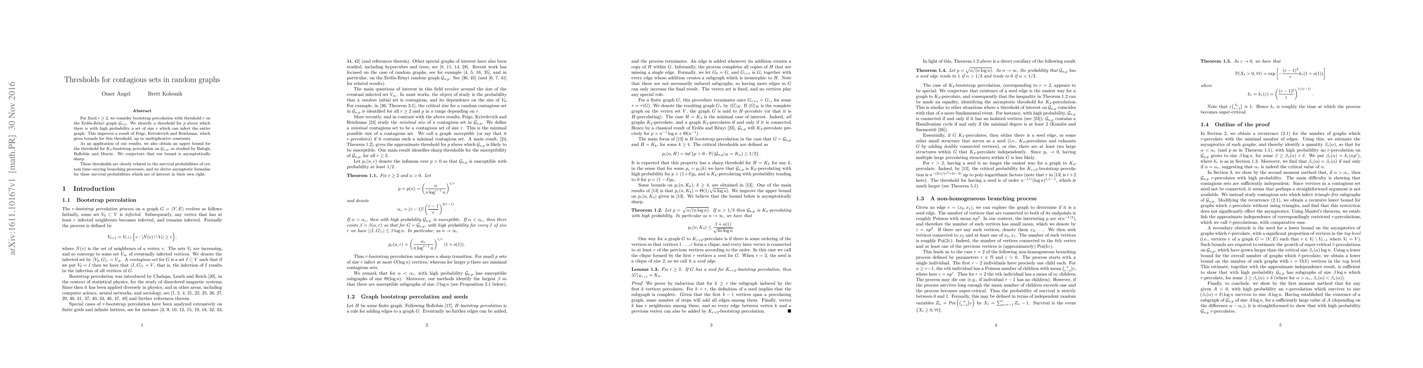 For fixed $r\geq 2$, we consider bootstrap percolation with threshold $r$ on the Erd\H{o}s-R\'enyi graph ${\cal G}_{n,p}$. We identify a threshold for $p$ above which there is with high probability a set of size $r$ which can infect the entire graph. This improves a result of Feige, Krivelevich and Reichman, which gives bounds for this threshold, up to multiplicative constants. As an application of our results, we also obtain an upper bound for the threshold for $K_4$-bootstrap percolation on ${\cal G}_{n,p}$, as studied by Balogh, Bollob\'as and Morris. We conjecture that our bound is asymptotically sharp. These thresholds are closely related to the survival probabilities of certain time-varying branching processes, and we derive asymptotic formulae for these survival probabilities which are of interest in their own right.