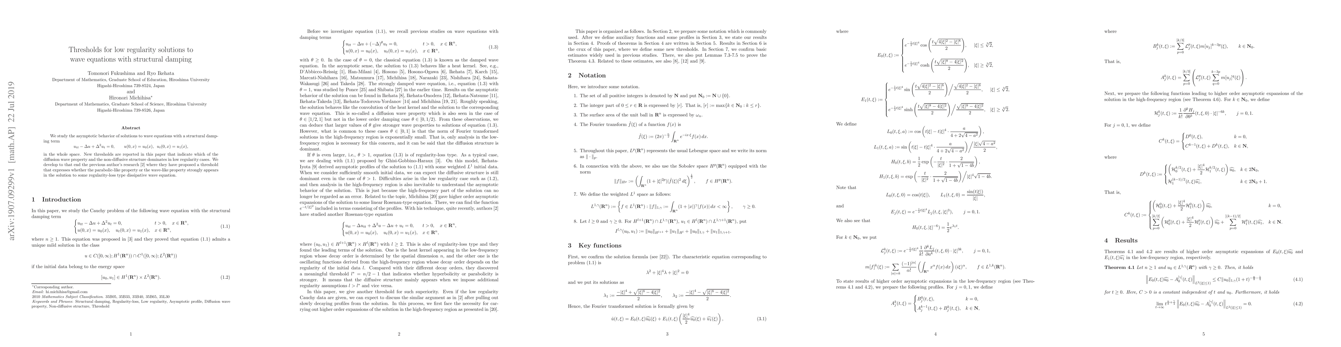 We study the asymptotic behavior of solutions to wave equations with a structural damping term \[ u_{tt}-\Delta u+\Delta^2 u_t=0, \qquad u(0,x)=u_0(x), \,\,\, u_t(0,x)=u_1(x), \] in the whole space. New thresholds are reported in this paper that indicate which of the diffusion wave property and the non-diffusive structure dominates in low regularity cases. We develop to that end the previous author's research in 2019 where they have proposed a threshold that expresses whether the parabolic-like property or the wave-like property strongly appears in the solution to some regularity-loss type dissipative wave equation.