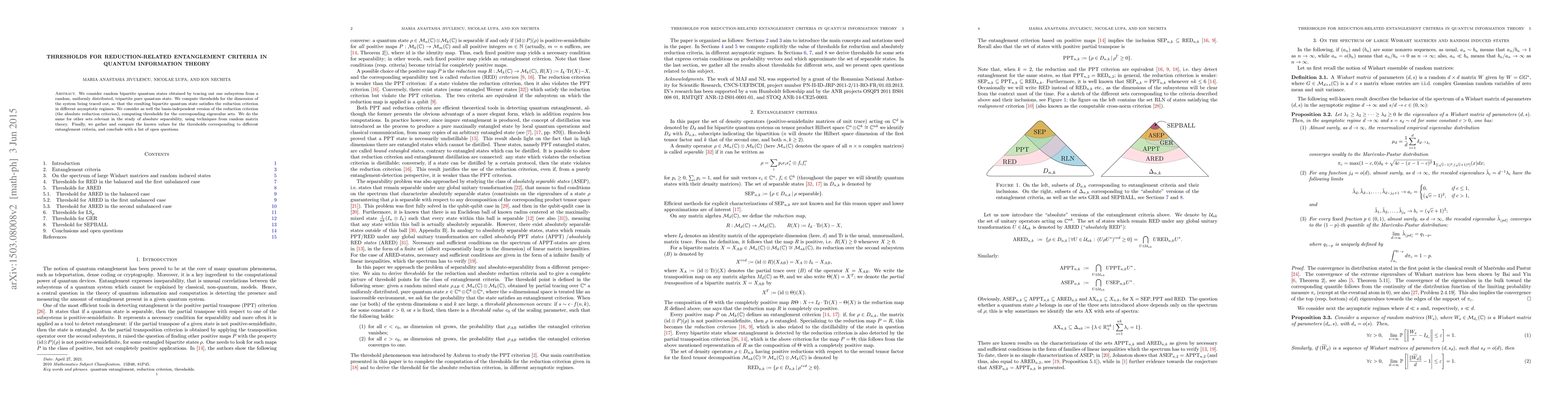 This paper computes thresholds for reduction-related entanglement criteria in bipartite quantum states derived from random tripartite pure quantum states. It uses random matrix theory to determine these thresholds and compares them with known values, concluding with a list of open questions.