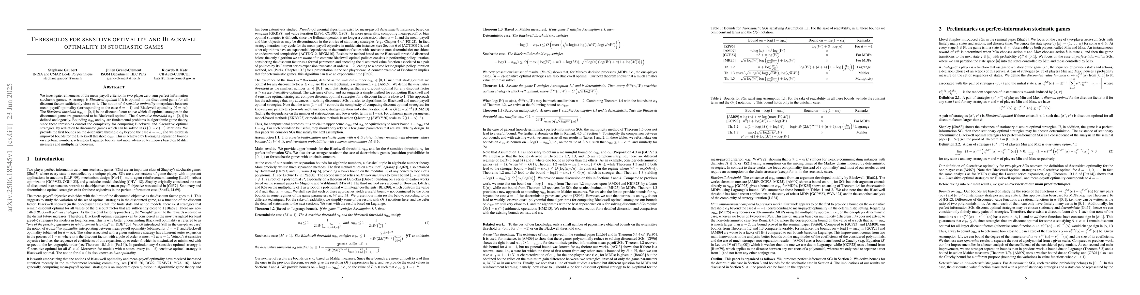 We investigate refinements of the mean-payoff criterion in two-player zero-sum perfect-information stochastic games. A strategy is Blackwell optimal if it is optimal in the discounted game for all discount factors sufficiently close to $1$. The notion of $d$-sensitive optimality interpolates between mean-payoff optimality (corresponding to the case $d=-1$) and Blackwell optimality ($d=+\infty$). The Blackwell threshold $\alpha_{\sf Bw} \in [0,1[$ is the discount factor above which all optimal strategies in the discounted game are guaranteed to be Blackwell optimal. The $d$-sensitive threshold $\alpha_{\sf d} \in [0,1[$ is defined analogously. Bounding $\alpha_{\sf Bw}$ and $\alpha_{\sf d}$ are fundamental problems in algorithmic game theory, since these thresholds control the complexity for computing Blackwell and $d$-sensitive optimal strategies, by reduction to discounted games which can be solved in $O\left((1-\alpha)^{-1}\right)$ iterations. We provide the first bounds on the $d$-sensitive threshold $\alpha_{\sf d}$ beyond the case $d=-1$, and we establish improved bounds for the Blackwell threshold $\alpha_{\sf Bw}$. This is achieved by leveraging separation bounds on algebraic numbers, relying on Lagrange bounds and more advanced techniques based on Mahler measures and multiplicity theorems.
