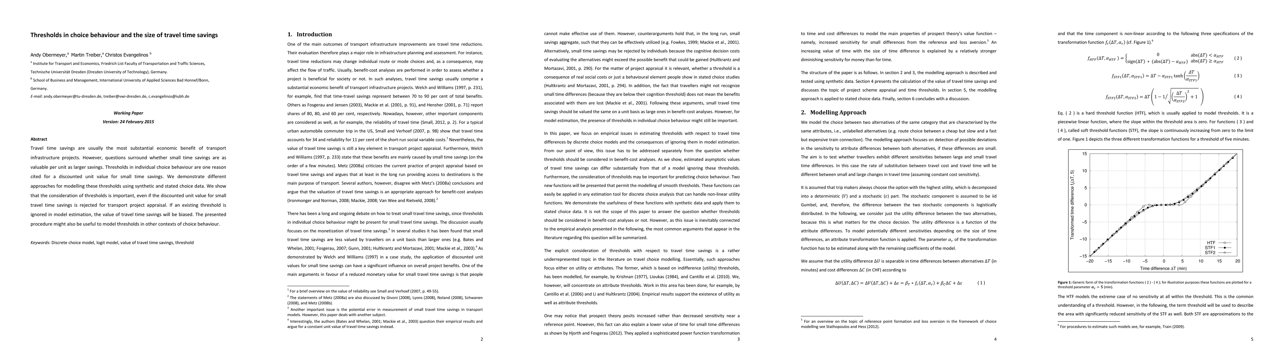 Travel time savings are usually the most substantial economic benefit of transport infrastructure projects. However, questions surround whether small time savings are as valuable per unit as larger savings. Thresholds in individual choice behaviour are one reason cited for a discounted unit value for small time savings. We demonstrate different approaches for modelling these thresholds using synthetic and stated choice data. We show that the consideration of thresholds is important, even if the discounted unit value for small travel time savings is rejected for transport project appraisal. If an existing threshold is ignored in model estimation, the value of travel time savings will be biased. The presented procedure might also be useful to model thresholds in other contexts of choice behaviour.