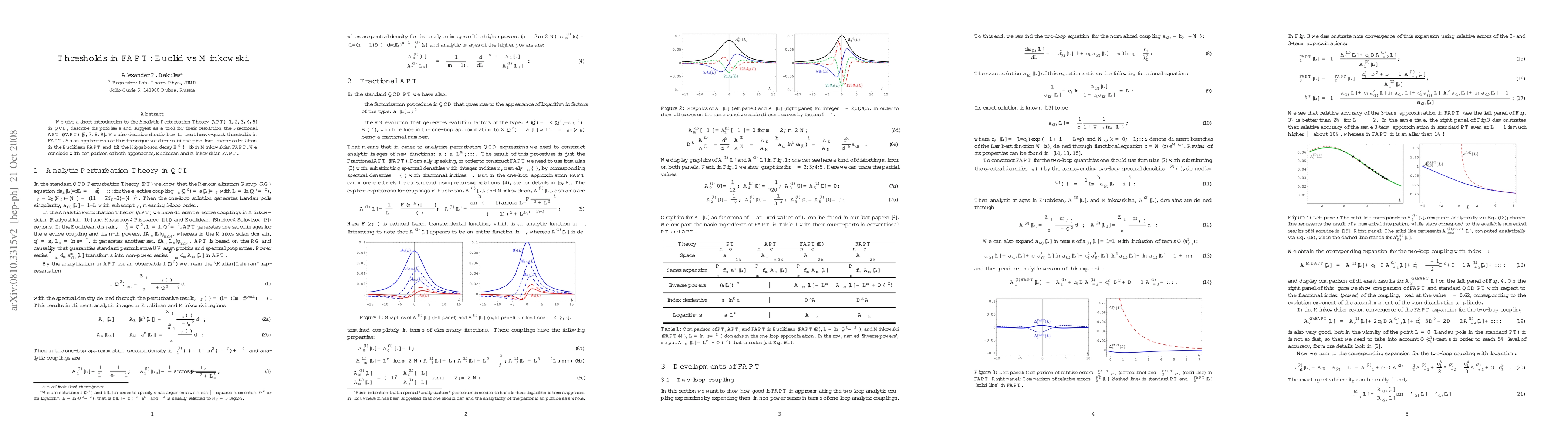 We give a short introduction to the Analytic Perturbation Theory (APT) in QCD, describe its problems and suggest as a tool for their resolution the Fractional APT (FAPT). We also describe shortly how to treat heavy-quark thresholds in FAPT. As an applications of this technique we discuss (i) the pion form factor calculation in the Euclidean FAPT and (ii) the Higgs boson decay $H^0\to b\bar{b}$ in Minkowskian FAPT. We conclude with comparison of both approaches, Euclidean and Minkowskian FAPT.