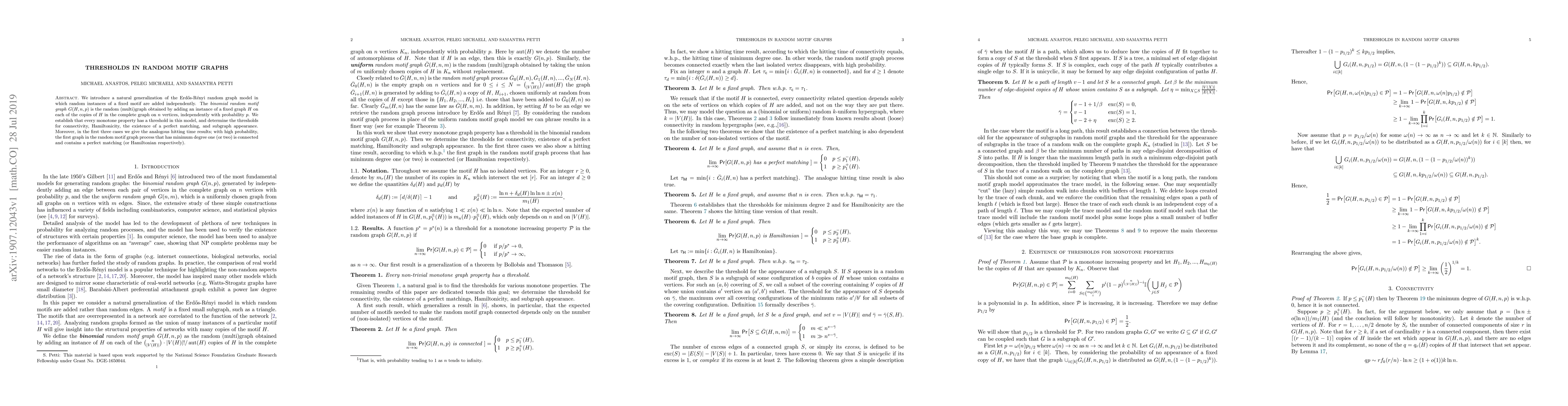 We introduce a natural generalization of the Erd\H{o}s-R\'enyi random graph model in which random instances of a fixed motif are added independently. The binomial random motif graph $G(H,n,p)$ is the random (multi)graph obtained by adding an instance of a fixed graph $H$ on each of the copies of $H$ in the complete graph on $n$ vertices, independently with probability $p$. We establish that every monotone property has a threshold in this model, and determine the thresholds for connectivity, Hamiltonicity, the existence of a perfect matching, and subgraph appearance. Moreover, in the first three cases we give the analogous hitting time results; with high probability, the first graph in the random motif graph process that has minimum degree one (or two) is connected and contains a perfect matching (or Hamiltonian respectively).