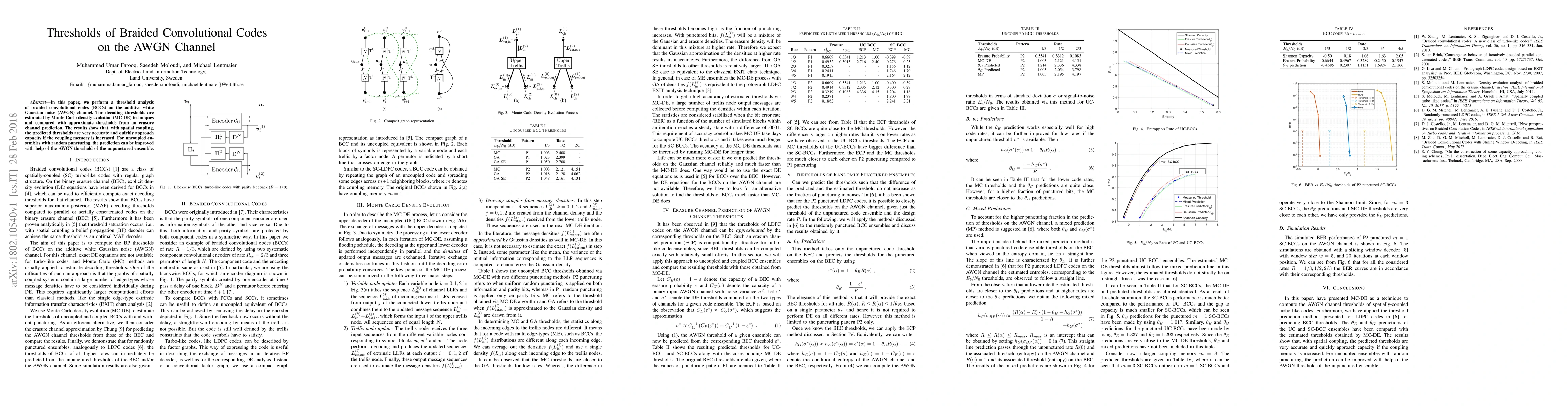 This paper analyzes the decoding thresholds of braided convolutional codes (BCCs) on the AWGN channel using Monte-Carlo density evolution techniques. The study finds that spatial coupling significantly improves prediction accuracy and approaches channel capacity with increased coupling memory.