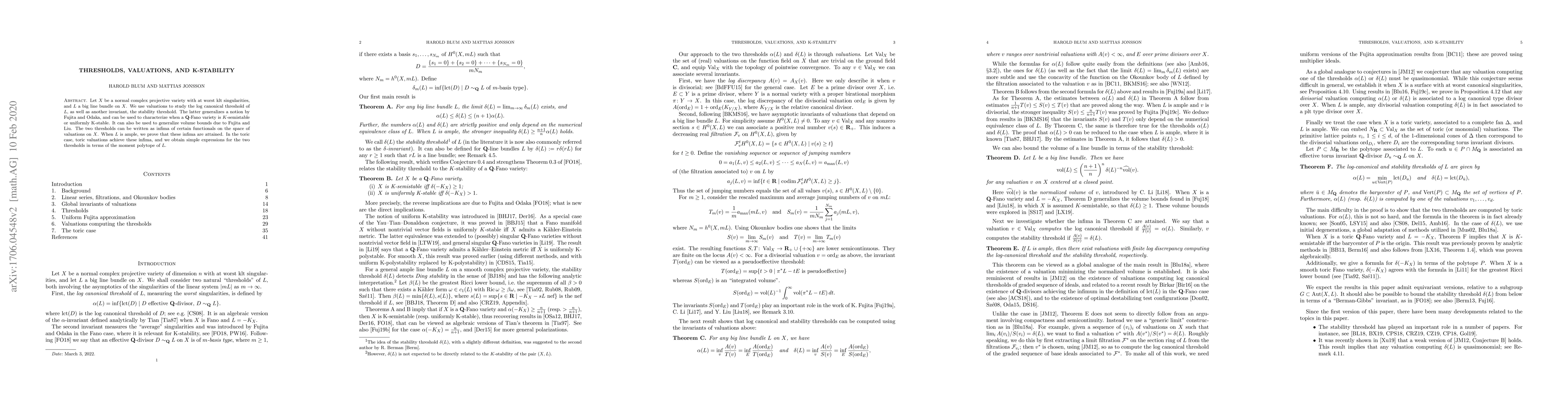 This paper explores the log canonical threshold and stability threshold of a big line bundle on a normal complex projective variety with klt singularities. It uses valuations to characterize K-stability and generalizes volume bounds, proving that these thresholds are attained when the line bundle is ample. In toric cases, toric valuations yield simple expressions linked to the moment polytope.