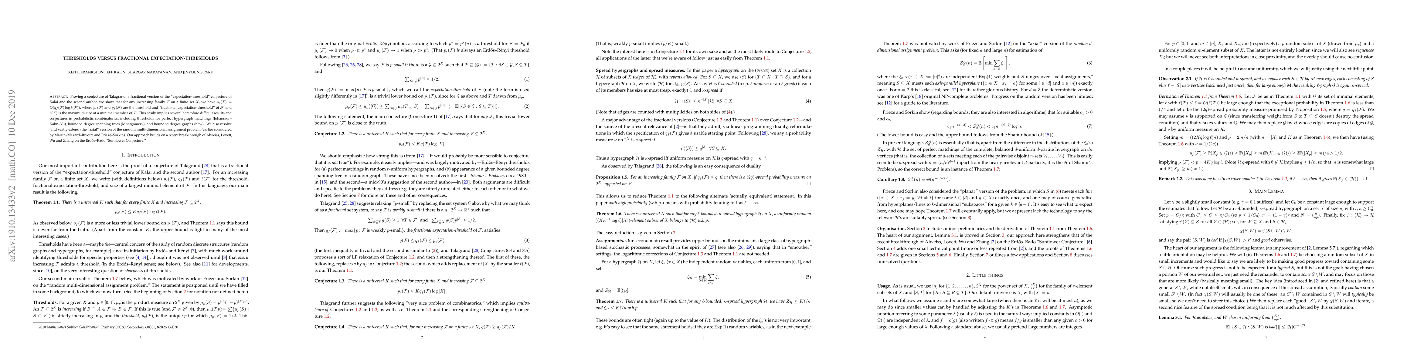 The paper utilizes probabilistic combinatorial techniques, specifically focusing on thresholds and fractional expectation-thresholds for families of sets on finite sets, building on recent breakthroughs such as Alweiss et al.'s work on the Erdős–Rado Sunflower Conjecture.