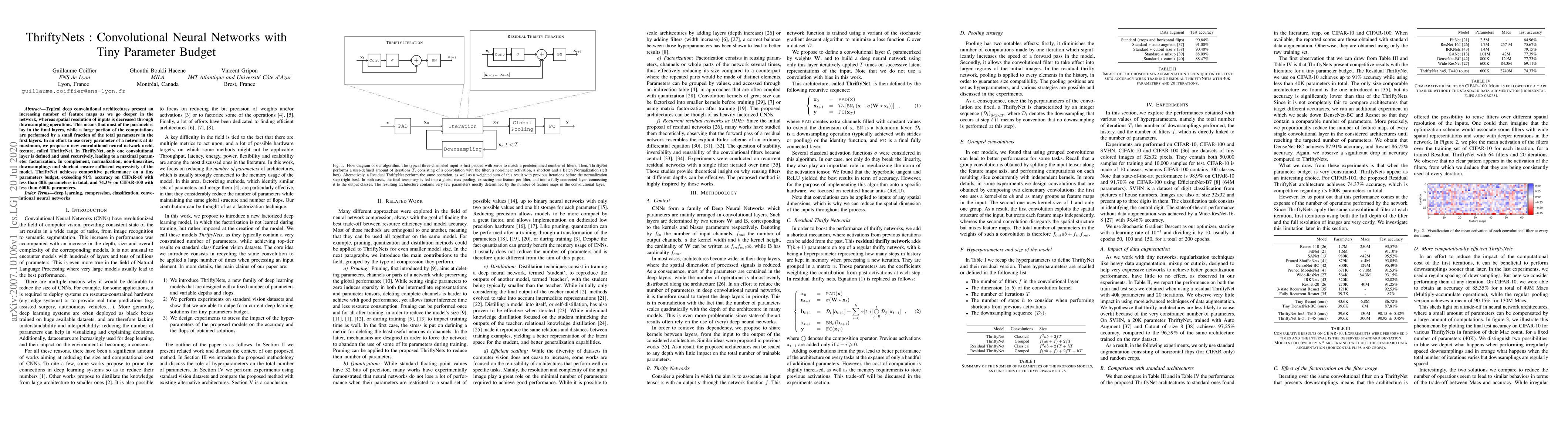 Typical deep convolutional architectures present an increasing number of feature maps as we go deeper in the network, whereas spatial resolution of inputs is decreased through downsampling operations. This means that most of the parameters lay in the final layers, while a large portion of the computations are performed by a small fraction of the total parameters in the first layers. In an effort to use every parameter of a network at its maximum, we propose a new convolutional neural network architecture, called ThriftyNet. In ThriftyNet, only one convolutional layer is defined and used recursively, leading to a maximal parameter factorization. In complement, normalization, non-linearities, downsamplings and shortcut ensure sufficient expressivity of the model. ThriftyNet achieves competitive performance on a tiny parameters budget, exceeding 91% accuracy on CIFAR-10 with less than 40K parameters in total, and 74.3% on CIFAR-100 with less than 600K parameters.