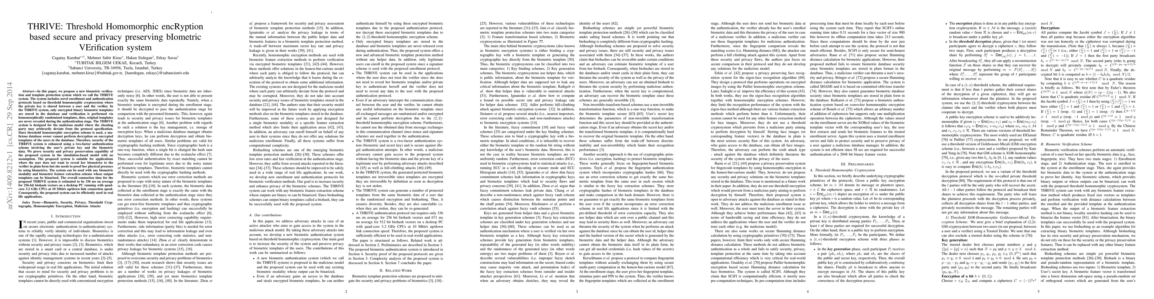 The THRIVE system proposes a secure biometric verification method using threshold homomorphic encryption, ensuring privacy by storing only encrypted templates and performing verification through randomized templates. This system enhances security with a two-factor authentication scheme, proving its effectiveness in a malicious model without assumptions.