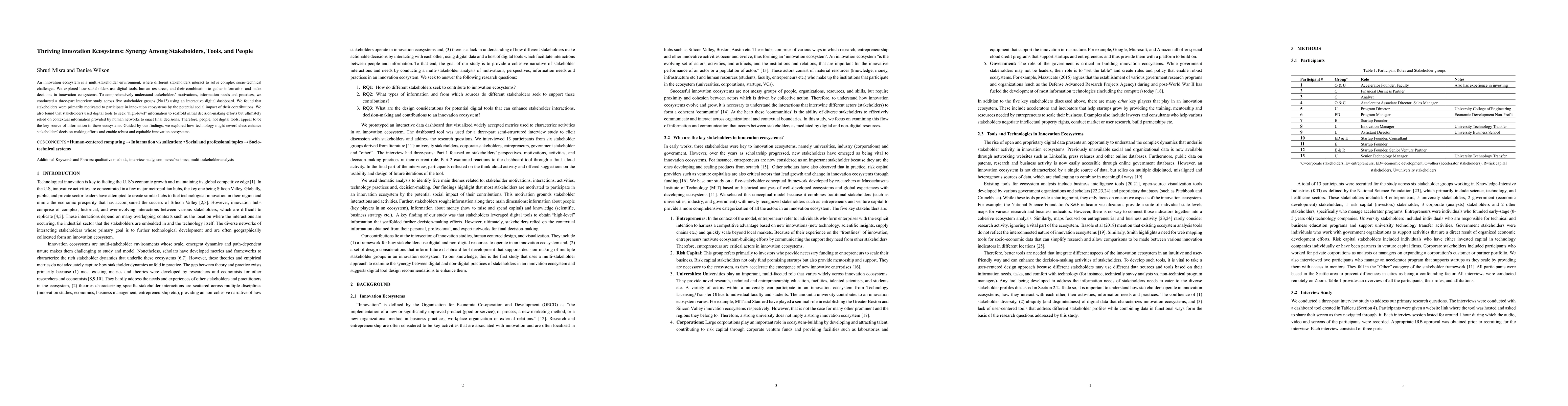 An innovation ecosystem is a multi-stakeholder environment, where different stakeholders interact to solve complex socio-technical challenges. We explored how stakeholders use digital tools, human resources, and their combination to gather information and make decisions in innovation ecosystems. To comprehensively understand stakeholders' motivations, information needs and practices, we conducted a three-part interview study across five stakeholder groups (N=13) using an interactive digital dashboard. We found that stakeholders were primarily motivated to participate in innovation ecosystems by the potential social impact of their contributions. We also found that stakeholders used digital tools to seek "high-level" information to scaffold initial decision-making efforts but ultimately relied on contextual information provided by human networks to enact final decisions. Therefore, people, not digital tools, appear to be the key source of information in these ecosystems. Guided by our findings, we explored how technology might nevertheless enhance stakeholders' decision-making efforts and enable robust and equitable innovation ecosystems.