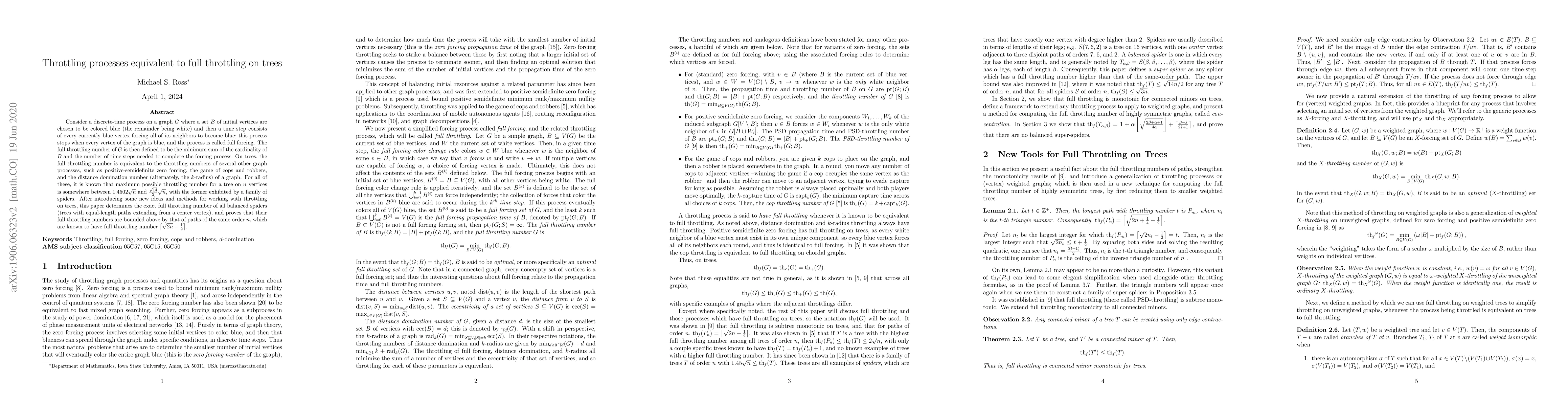 Consider a discrete-time process on a graph $G$ where a set $B$ of initial vertices are chosen to be colored blue (the remainder being white) and then a time step consists of every currently blue vertex forcing all of its neighbors to become blue; this process stops when every vertex of the graph is blue, and the process is called full forcing. The full throttling number of $G$ is then defined to be the minimum sum of the cardinality of $B$ and the number of time steps needed to complete the forcing process. On trees, the full throttling number is equivalent to the throttling numbers of several other graph processes, such as positive-semidefinite zero forcing, the game of cops and robbers, and the distance domination number (alternately, the $k$-radius) of a graph. For all of these, it is known that maximum possible throttling number for a tree on $n$ vertices is somewhere between $1.4502\sqrt{n}$ and $\frac{\sqrt{14}}{2}\sqrt{n}$, with the former exhibited by a family of spiders. After introducing some new ideas and methods for working with throttling on trees, this paper determines the exact full throttling number of all balanced spiders (trees with equal-length paths extending from a center vertex), and proves that their full throttling numbers are bounded above by that of paths of the same order $n$, which are known to have full throttling number $\lceil\sqrt{2n}-\frac{1}{2}\rceil$.