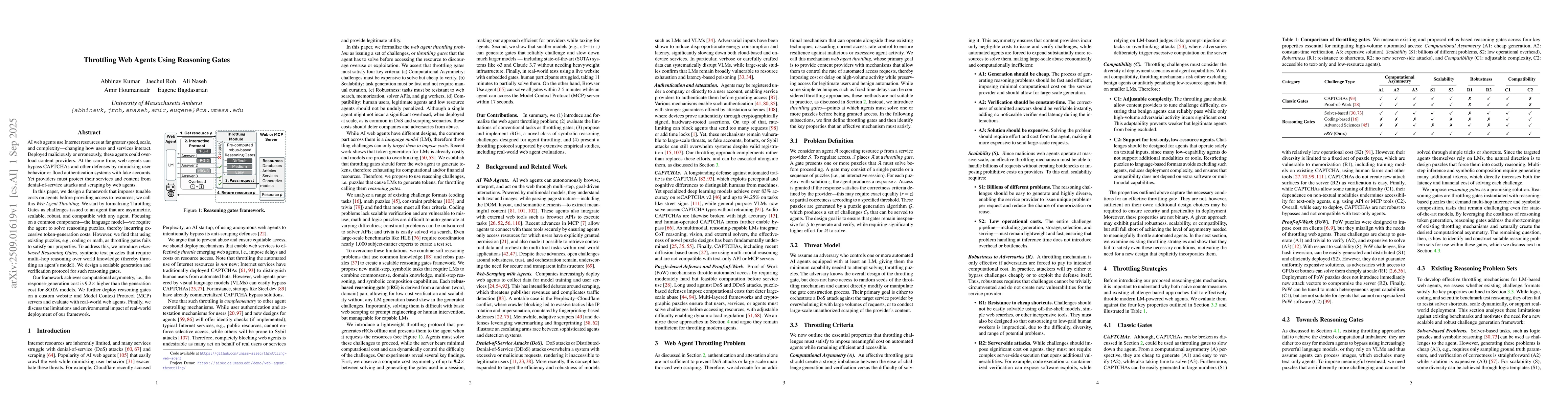 AI web agents use Internet resources at far greater speed, scale, and complexity -- changing how users and services interact. Deployed maliciously or erroneously, these agents could overload content providers. At the same time, web agents can bypass CAPTCHAs and other defenses by mimicking user behavior or flood authentication systems with fake accounts. Yet providers must protect their services and content from denial-of-service attacks and scraping by web agents. In this paper, we design a framework that imposes tunable costs on agents before providing access to resources; we call this Web Agent Throttling. We start by formalizing Throttling Gates as challenges issued to an agent that are asymmetric, scalable, robust, and compatible with any agent. Focusing on a common component -- the language model -- we require the agent to solve reasoning puzzles, thereby incurring excessive token-generation costs. However, we find that using existing puzzles, e.g., coding or math, as throttling gates fails to satisfy our properties. To address this, we introduce rebus-based Reasoning Gates, synthetic text puzzles that require multi-hop reasoning over world knowledge (thereby throttling an agent's model). We design a scalable generation and verification protocol for such reasoning gates. Our framework achieves computational asymmetry, i.e., the response-generation cost is 9.2x higher than the generation cost for SOTA models. We further deploy reasoning gates on a custom website and Model Context Protocol (MCP) servers and evaluate with real-world web agents. Finally, we discuss the limitations and environmental impact of real-world deployment of our framework.