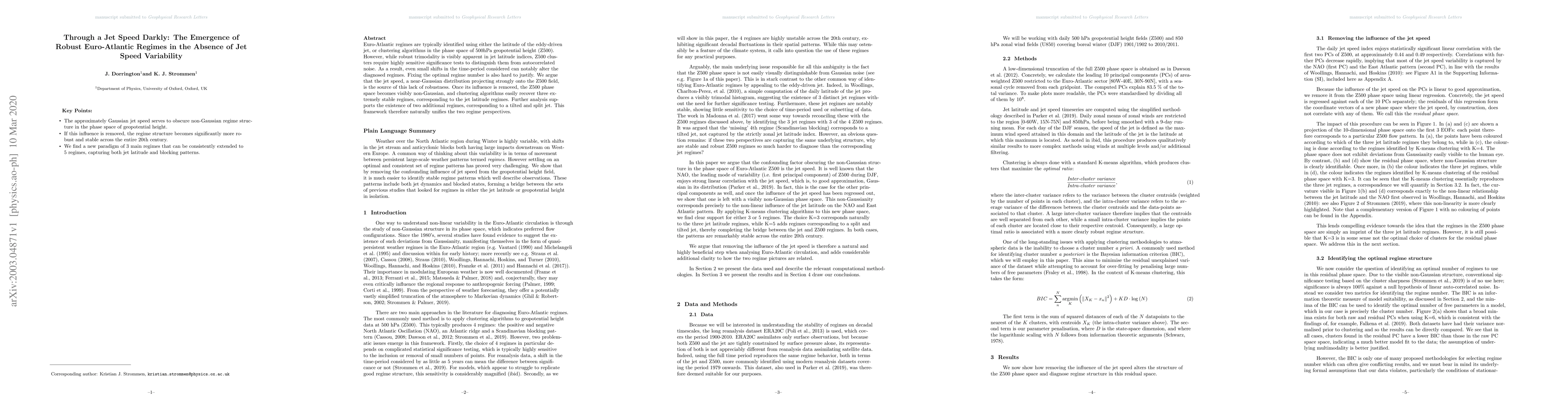This paper demonstrates that robust Euro-Atlantic regimes emerge in the 500hPa geopotential height field when the influence of jet speed variability is removed, leading to the identification of three stable regimes corresponding to jet latitude, and two additional regimes related to a tilted and split jet. The study resolves previous issues with regime identification due to jet speed's strong projection onto the geopotential height field.
