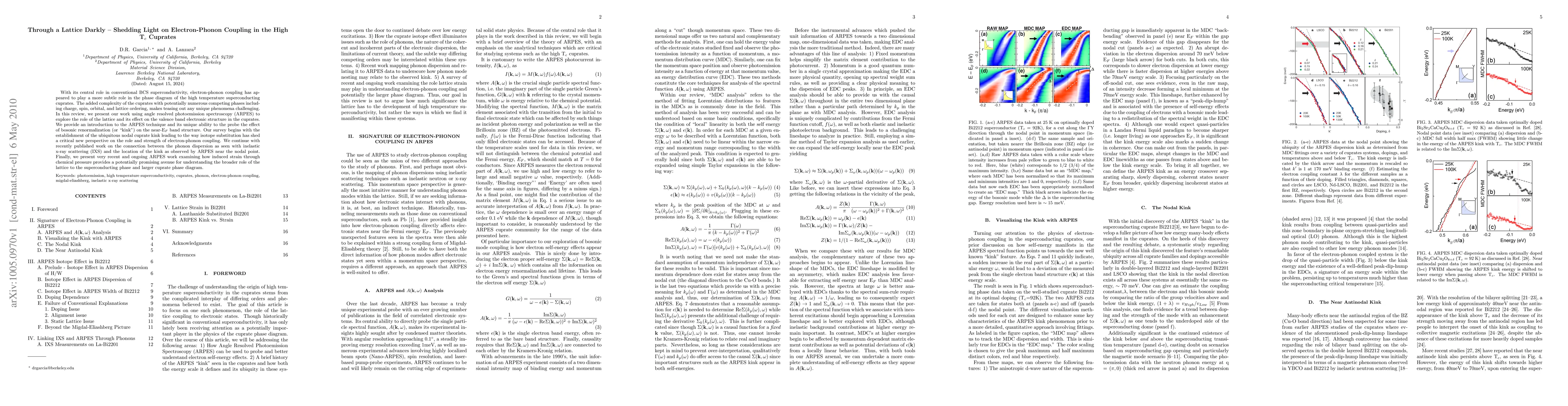 This paper reviews the role of electron-phonon coupling in high-temperature superconducting cuprates using angle-resolved photoemission spectroscopy (ARPES). It highlights the ARPES technique's ability to probe the lattice's effect on electronic structure, focusing on the nodal cuprate kink and its relation to isotope substitution and phonon dispersion, while also discussing the impact of induced strain on superconductivity.