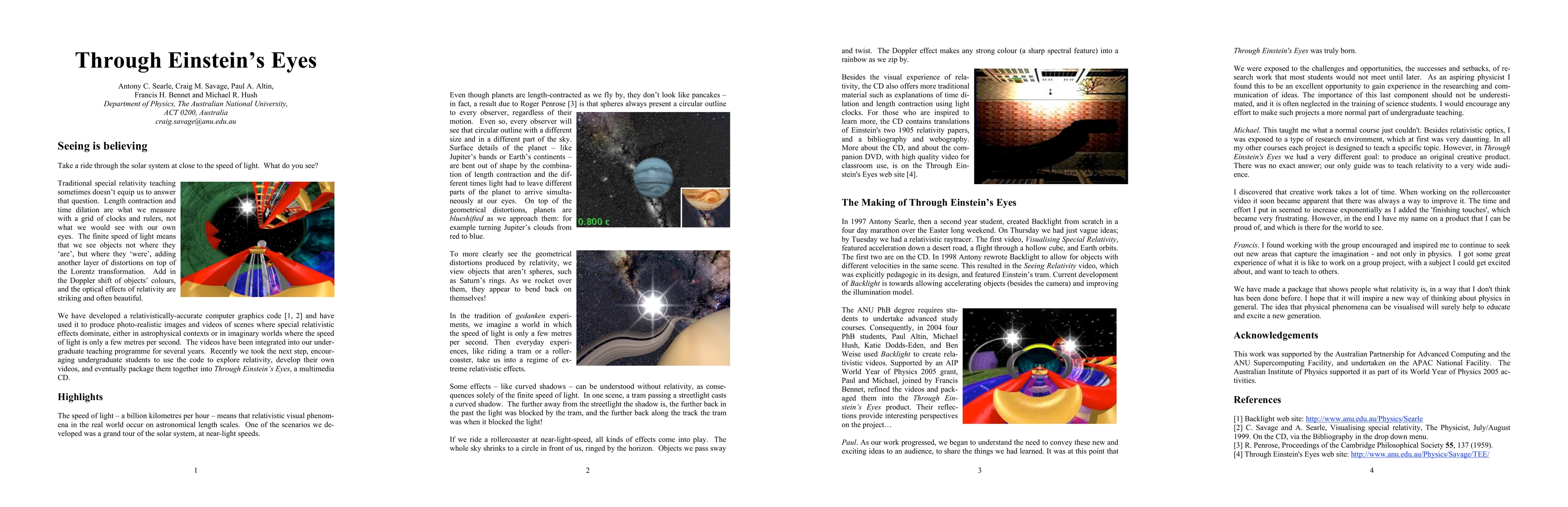 This research developed a relativistically-accurate computer graphics code to create photo-realistic images and videos showcasing special relativistic effects, which has been integrated into the undergraduate teaching program. The project culminated in a multimedia CD, "Through Einstein's Eyes," where students use the code to explore relativity and create their own content.