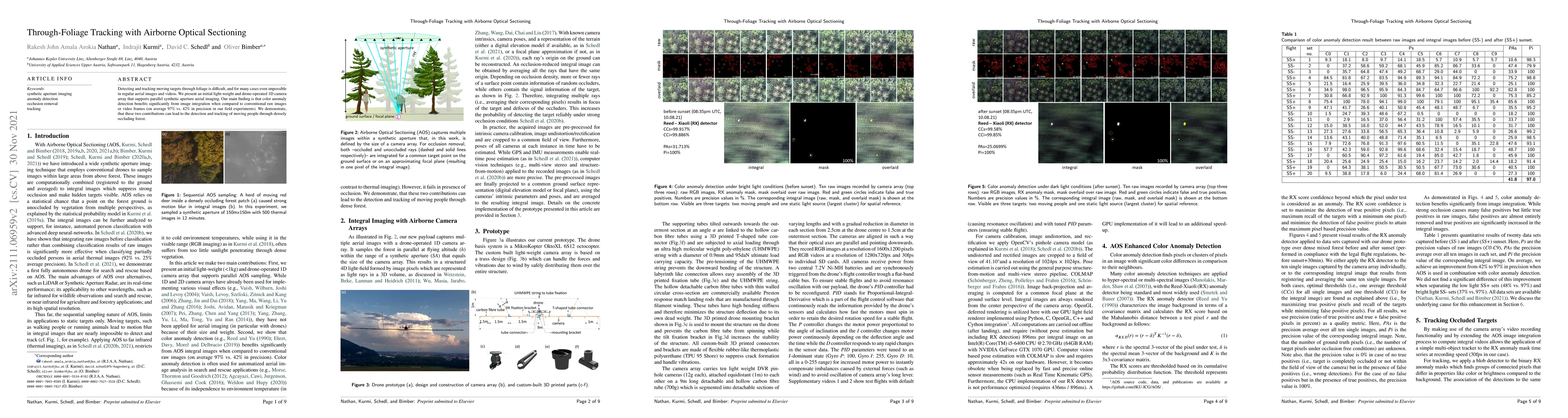 A lightweight drone-based camera system uses 1D synthetic aperture imaging to detect and track people through dense foliage with high precision, outperforming traditional methods in 97% of cases.