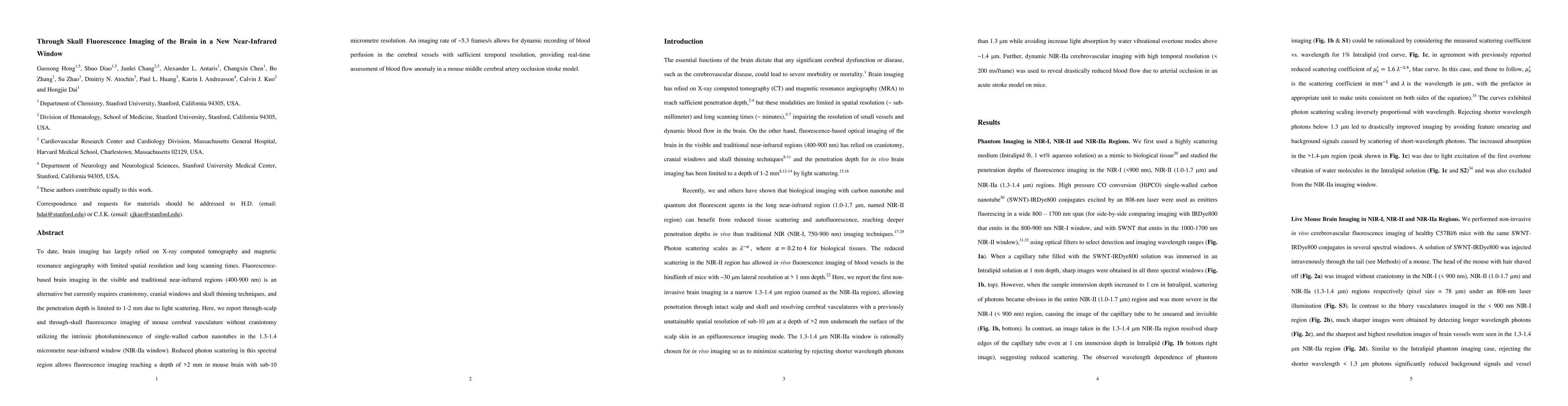 This paper presents a novel fluorescence imaging technique using single-walled carbon nanotubes in the near-infrared window of 1.3-1.4 micrometers, enabling through-skull brain imaging in mice without craniotomy. This method achieves >2 mm depth penetration and sub-10 micrometer resolution, allowing dynamic recording of cerebral blood perfusion and real-time stroke assessment.