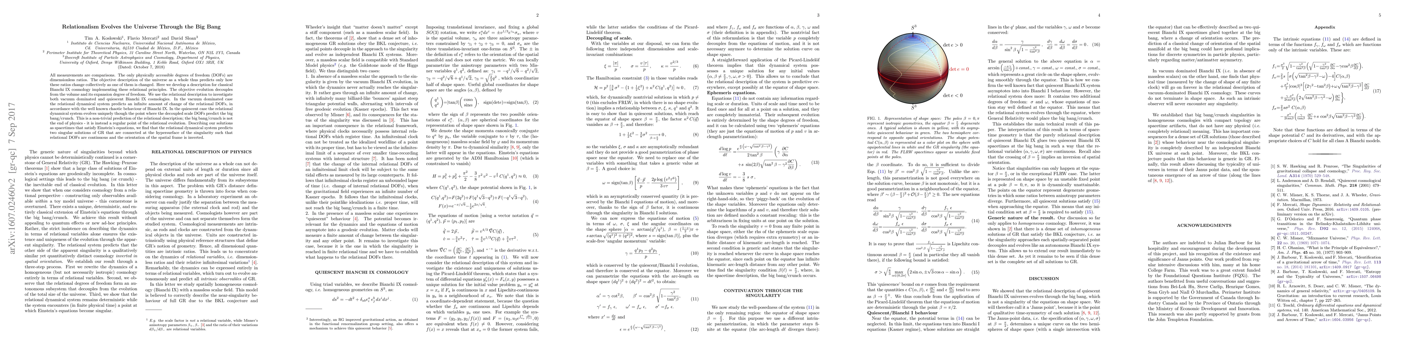All measurements are comparisons. The only physically accessible degrees of freedom (DOFs) are dimensionless ratios. The objective description of the universe as a whole thus predicts only how these ratios change collectively as one of them is changed. Here we develop a description for classical Bianchi IX cosmology implementing these relational principles. The objective evolution decouples from the volume and its expansion degree of freedom. We use the relational description to investigate both vacuum dominated and quiescent Bianchi IX cosmologies. In the vacuum dominated case the relational dynamical system predicts an infinite amount of change of the relational DOFs, in accordance with the well known chaotic behaviour of Bianchi IX. In the quiescent case the relational dynamical system evolves uniquely though the point where the decoupled scale DOFs predict the big bang/crunch. This is a non-trivial prediction of the relational description; the big bang/crunch is not the end of physics - it is instead a regular point of the relational evolution. Describing our solutions as spacetimes that satisfy Einstein's equations, we find that the relational dynamical system predicts two singular solutions of GR that are connected at the hypersurface of the singularity such that relational DOFs are continuous and the orientation of the spatial frame is inverted.