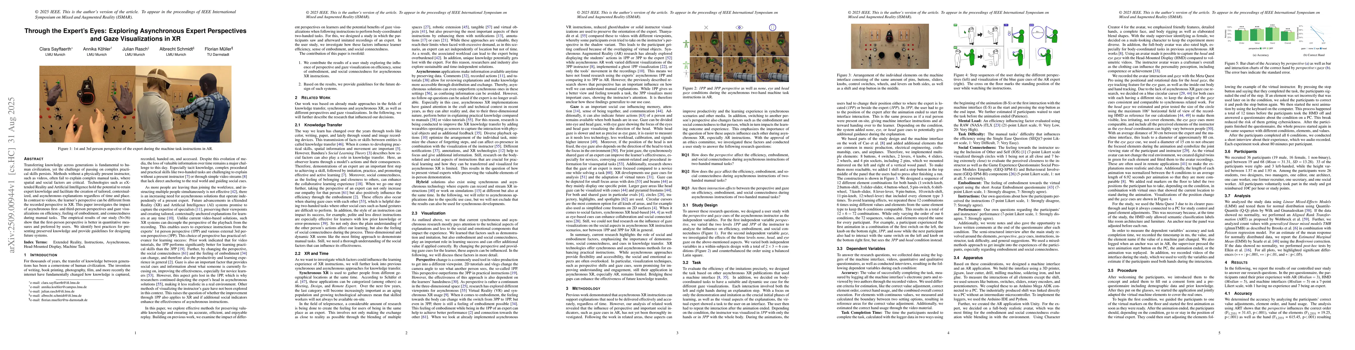 Transferring knowledge across generations is fundamental to human civilization, yet the challenge of passing on complex practical skills persists. Methods without a physically present instructor, such as videos, often fail to explain complex manual tasks, where spatial and social factors are critical. Technologies such as eXtended Reality and Artificial Intelligence hold the potential to retain expert knowledge and facilitate the creation of tailored, contextualized, and asynchronous explanations regardless of time and place. In contrast to videos, the learner's perspective can be different from the recorded perspective in XR. This paper investigates the impact of asynchronous first- and third-person perspectives and gaze visualizations on efficiency, feeling of embodiment, and connectedness during manual tasks. The empirical results of our study (N=36) show that the first-person perspective is better in quantitative measures and preferred by users. We identify best practices for presenting preserved knowledge and provide guidelines for designing future systems.