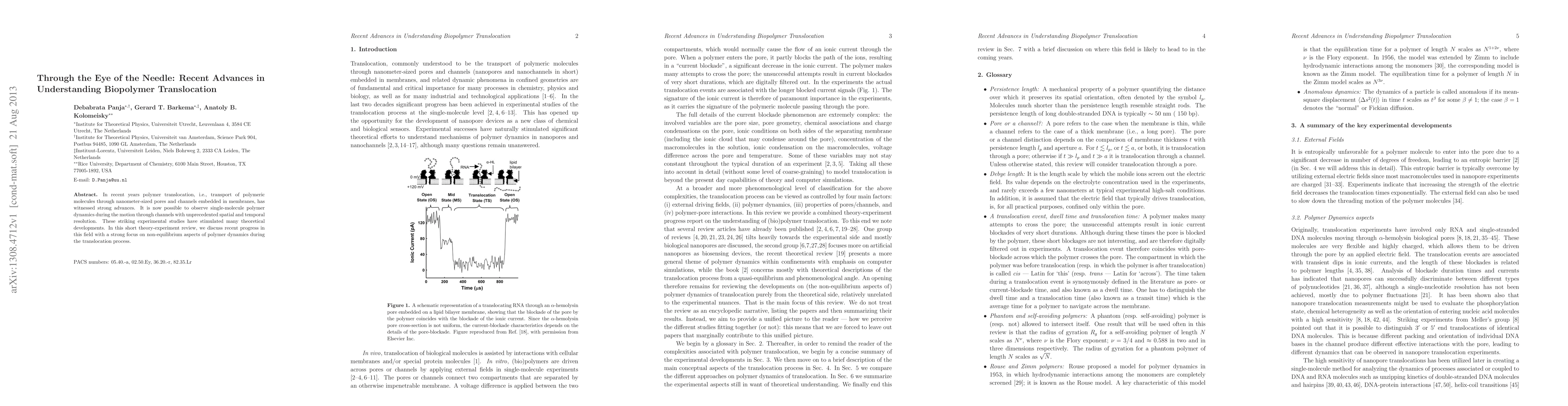 This paper reviews recent advances in understanding polymer translocation through nanometer-sized pores, highlighting new experimental techniques that allow for single-molecule observation and theoretical developments focusing on the non-equilibrium dynamics of the process.