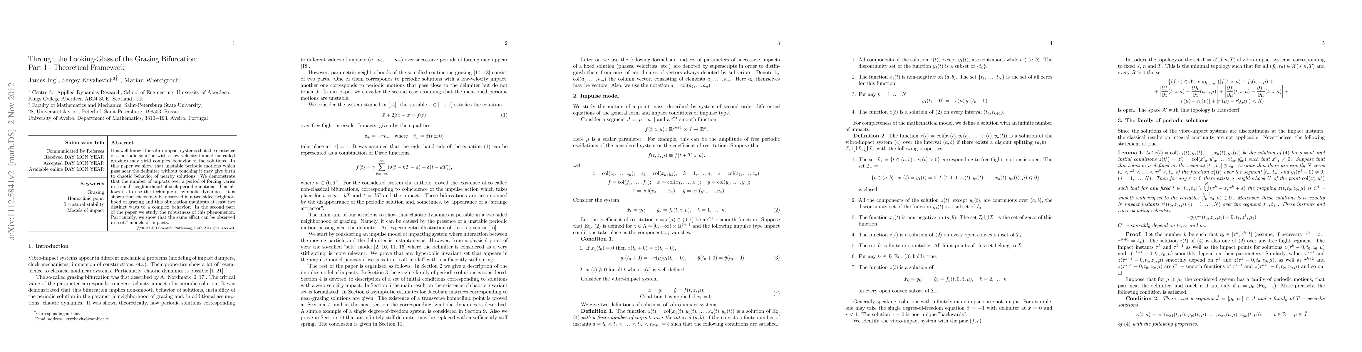 It is well-known for vibro-impact systems that the existence of a periodic solution with a low-velocity impact (so-called grazing) may yield complex behavior of the solutions. In this paper we show that unstable periodic motions which pass near the delimiter without touching it may give birth to chaotic behavior of nearby solutions. We demonstrate that the number of impacts over a period of forcing varies in a small neighborhood of such periodic motions. This allows us to use the technique of symbolic dynamics. It is shown that chaos may be observed in a two-sided neighborhood of grazing and this bifurcation manifests at least two distinct ways to a complex behavior. In the second part of the paper we study the robustness of this phenomenon. Particularly, we show that the same effect can be observed in "soft" models of impacts.