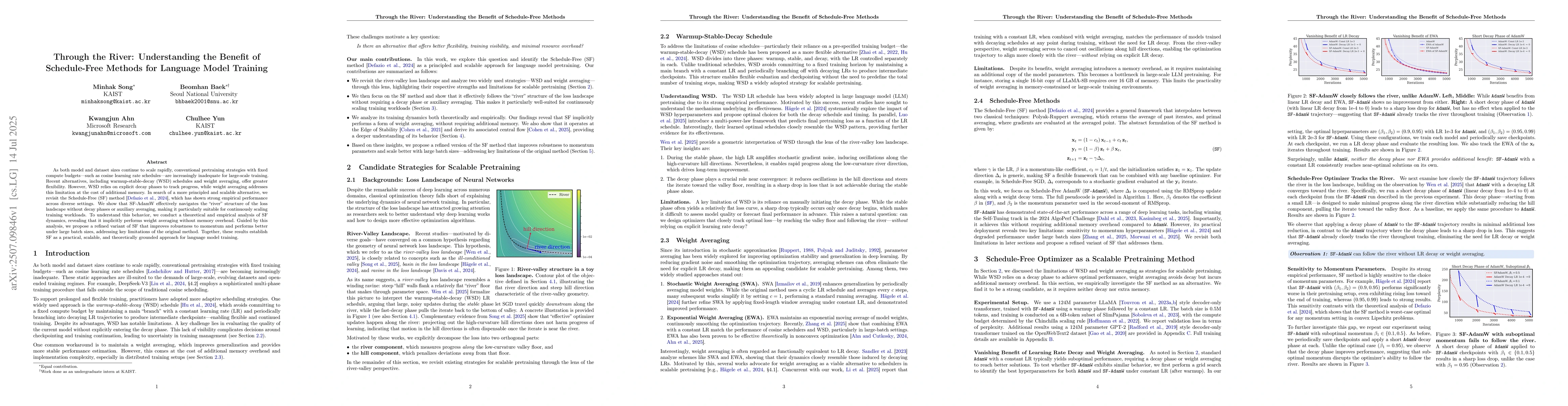 As both model and dataset sizes continue to scale rapidly, conventional pretraining strategies with fixed compute budgets-such as cosine learning rate schedules-are increasingly inadequate for large-scale training. Recent alternatives, including warmup-stable-decay (WSD) schedules and weight averaging, offer greater flexibility. However, WSD relies on explicit decay phases to track progress, while weight averaging addresses this limitation at the cost of additional memory. In search of a more principled and scalable alternative, we revisit the Schedule-Free (SF) method [Defazio et al., 2024], which has shown strong empirical performance across diverse settings. We show that SF-AdamW effectively navigates the "river" structure of the loss landscape without decay phases or auxiliary averaging, making it particularly suitable for continuously scaling training workloads. To understand this behavior, we conduct a theoretical and empirical analysis of SF dynamics, revealing that it implicitly performs weight averaging without memory overhead. Guided by this analysis, we propose a refined variant of SF that improves robustness to momentum and performs better under large batch sizes, addressing key limitations of the original method. Together, these results establish SF as a practical, scalable, and theoretically grounded approach for language model training.
