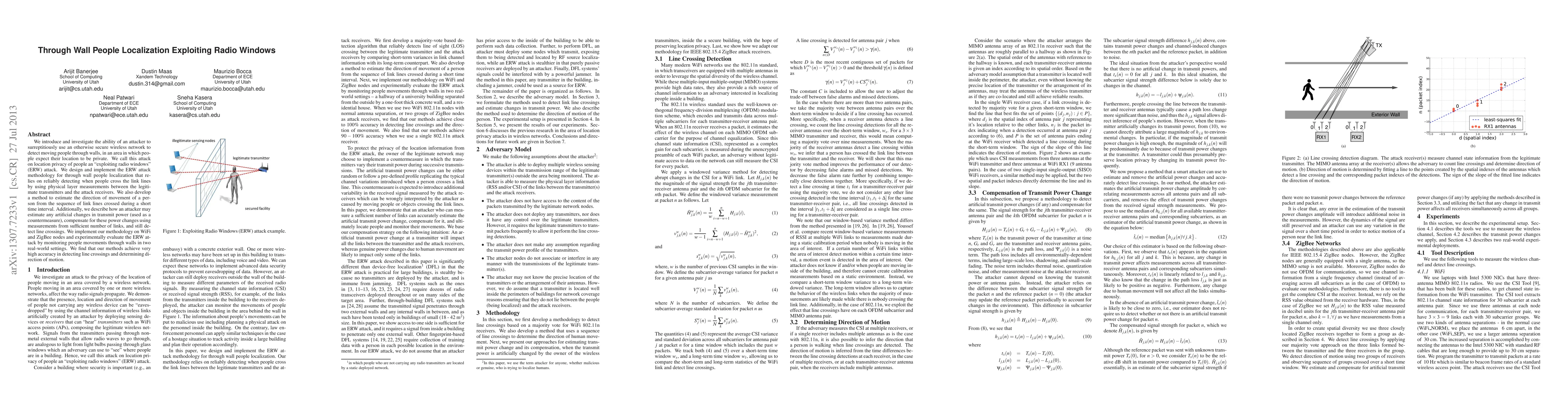 This paper explores a novel "exploiting radio windows" (ERW) attack that allows an attacker to detect and track people moving through walls using wireless network signals, even in private areas. The authors implement and evaluate this method on WiFi and ZigBee networks, demonstrating high accuracy in detecting line crossings and estimating movement direction.