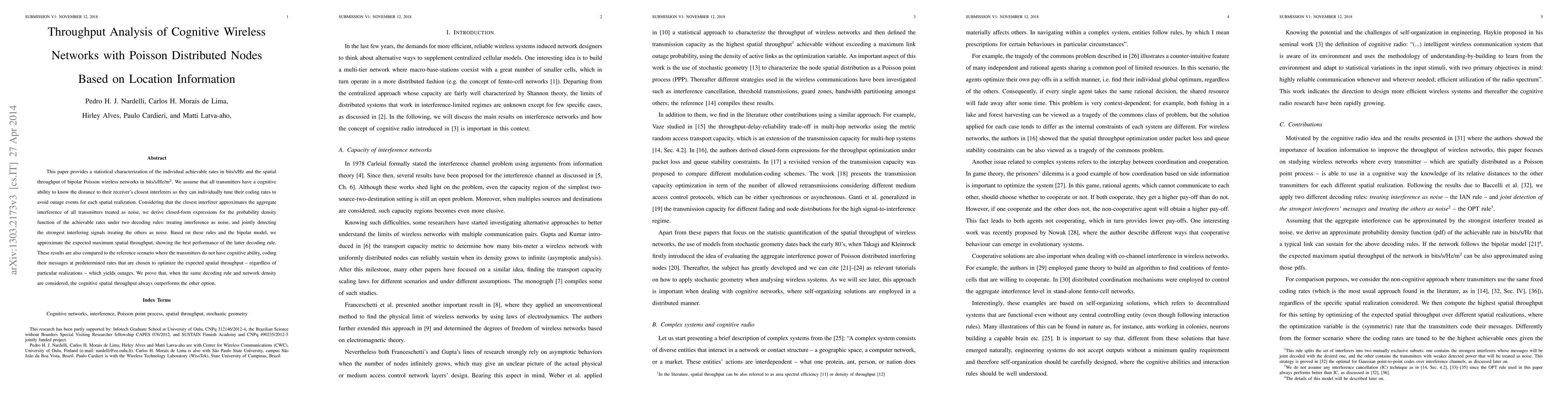 A research paper analyzes cognitive wireless networks with Poisson distributed nodes based on location information to provide statistical characterization of achievable rates and spatial throughput. It shows that a decoding rule jointly detecting the strongest interfering signals outperforms traditional methods.