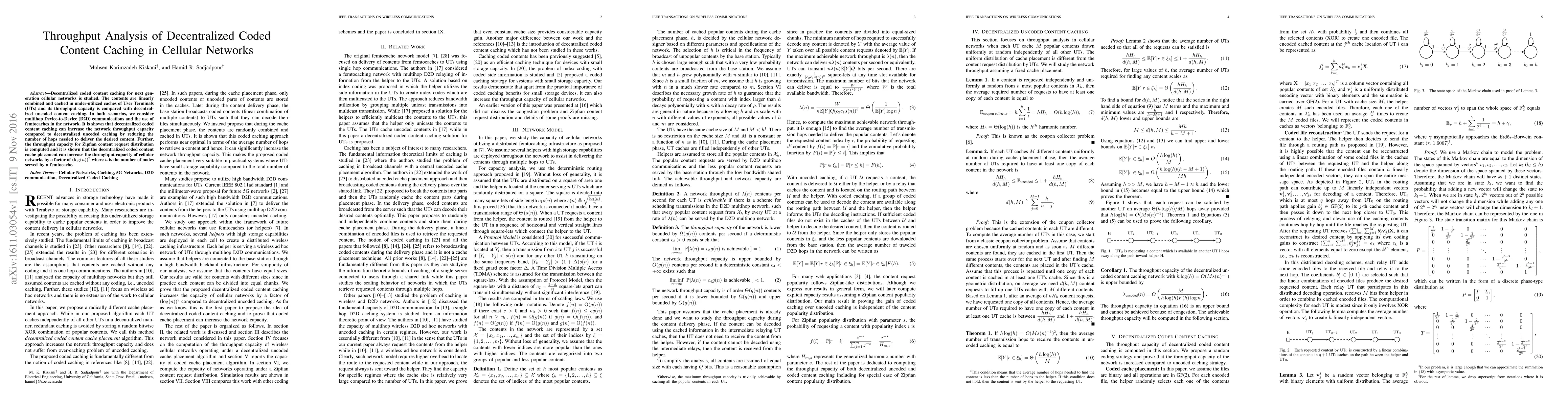 Decentralized coded content caching for next generation cellular networks is studied. The contents are linearly combined and cached in under-utilized caches of User Terminals (UTs) and its throughput capacity is compared with decentralized uncoded content caching. In both scenarios, we consider multihop Device-to-Device (D2D) communications and the use of femtocaches in the network. It is shown that decentralized coded content caching can increase the network throughput capacity compared to decentralized uncoded caching by reducing the number of hops needed to deliver the desired content. Further, the throughput capacity for Zipfian content request distribution is computed and it is shown that the decentralized coded content cache placement can increase the throughput capacity of cellular networks by a factor of $(\log(n))^2$ where $n$ is the number of nodes served by a femtocache.