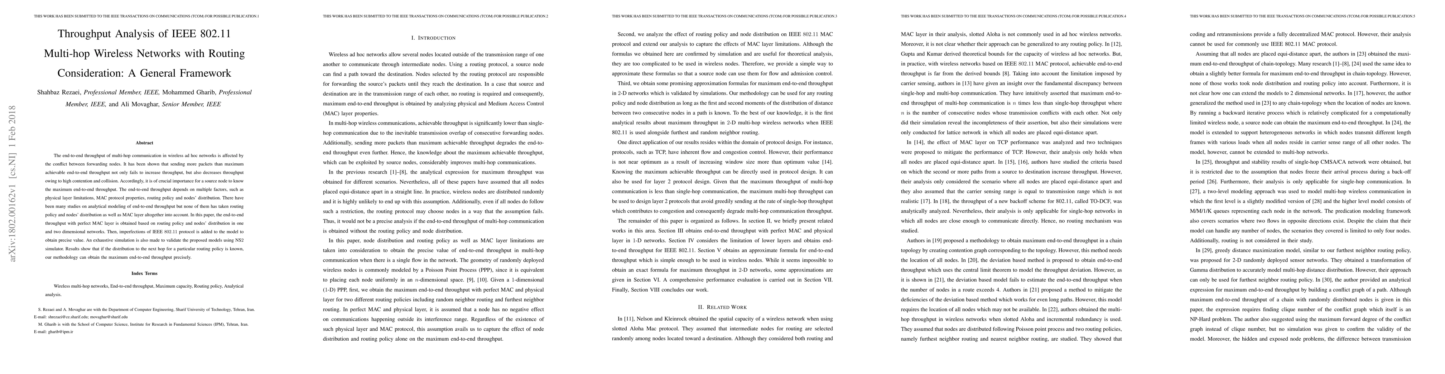 This paper presents a comprehensive framework for analyzing the end-to-end throughput in IEEE 802.11 multi-hop wireless networks, considering routing policies and node distribution. It combines analytical modeling with simulation to account for both perfect and imperfect MAC layer conditions, providing precise throughput estimations.