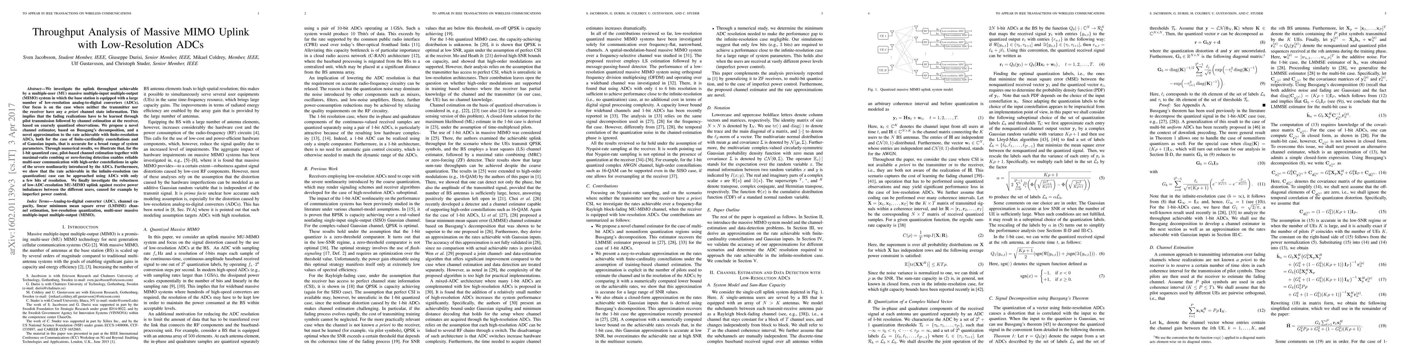 The research investigates the uplink throughput of a massive MIMO system with low-resolution ADCs, employing Bussgang's decomposition for a novel channel estimator and rate approximation for finite-cardinality constellations and Gaussian inputs.